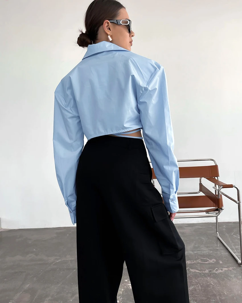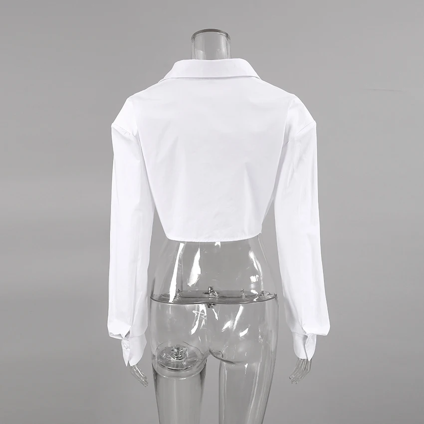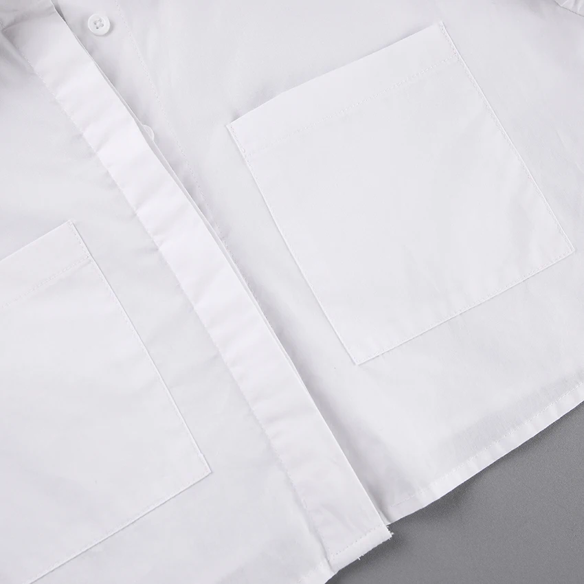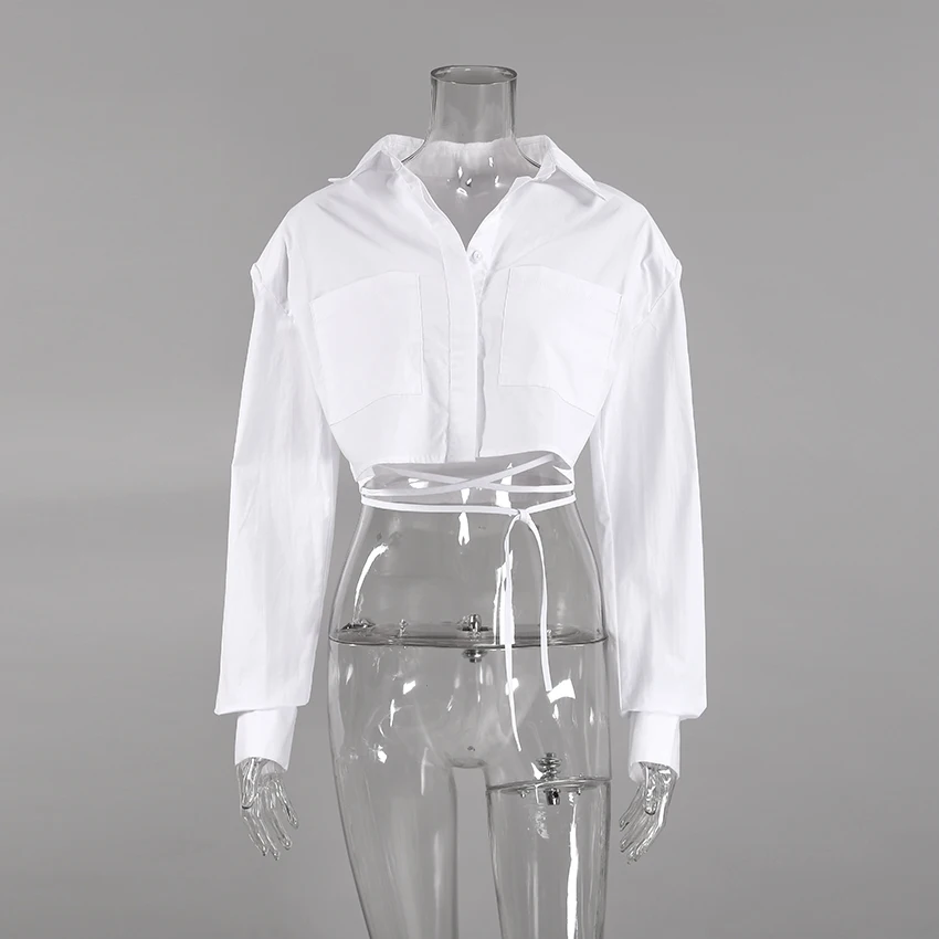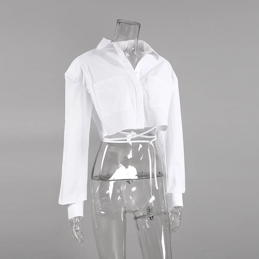 Bclout/QINSI Pleated Fashion Ladies Double Pockets Blouses Solid Women Autumn 2022 Lace Up Lapel Tops Street Cropped White Shirt