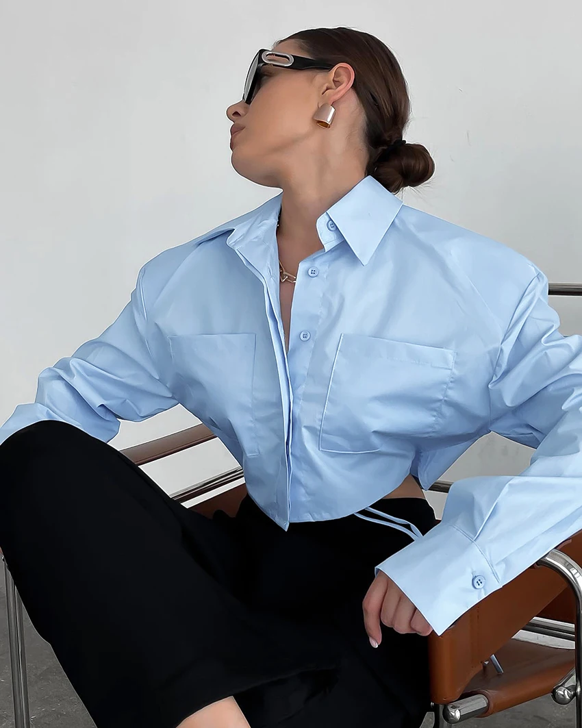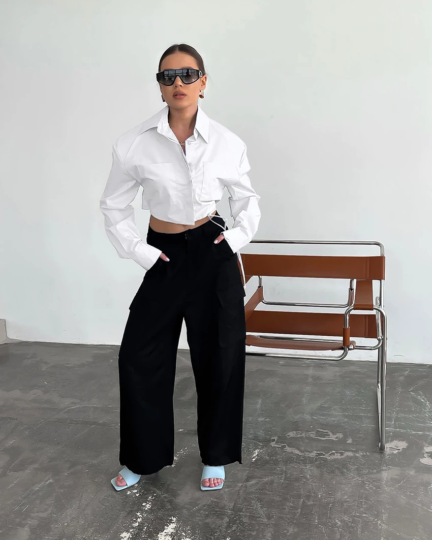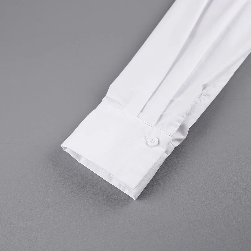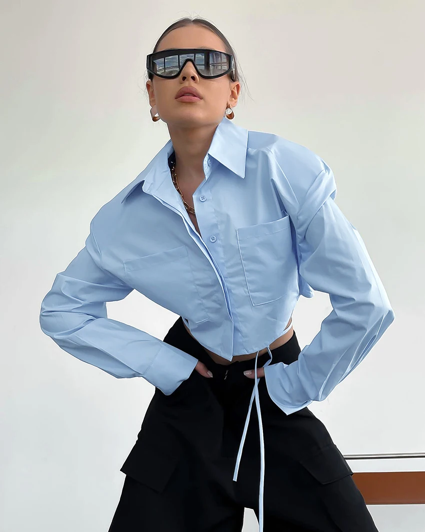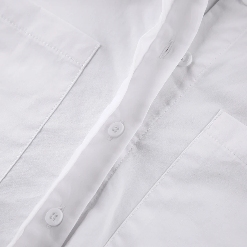 Bclout/QINSI Pleated Fashion Ladies Double Pockets Blouses Solid Women Autumn 2022 Lace Up Lapel Tops Street Cropped White Shirt