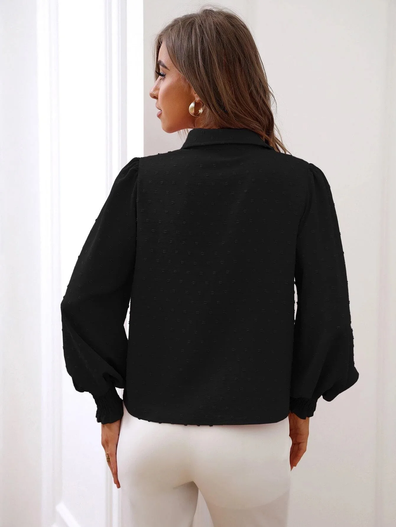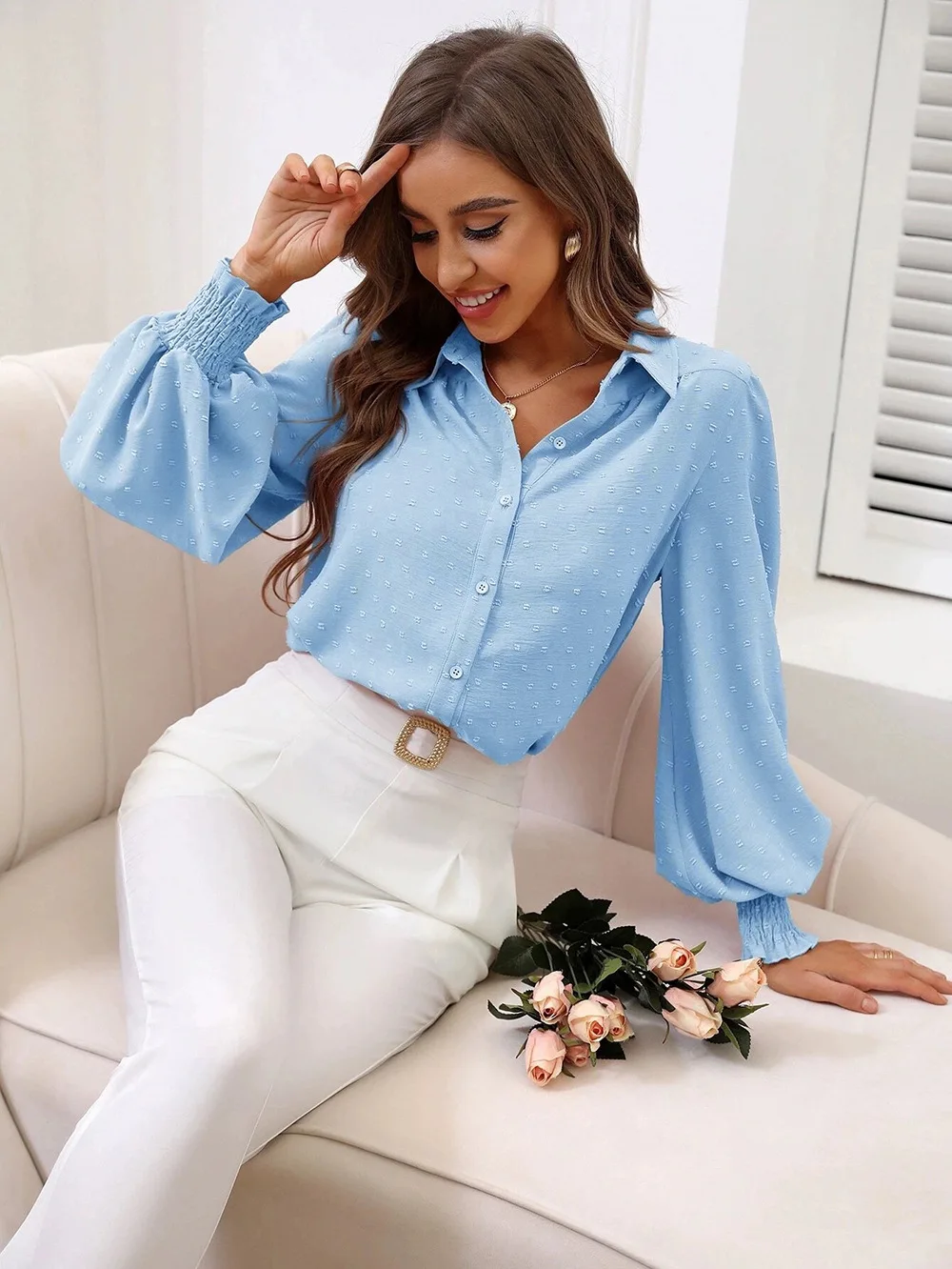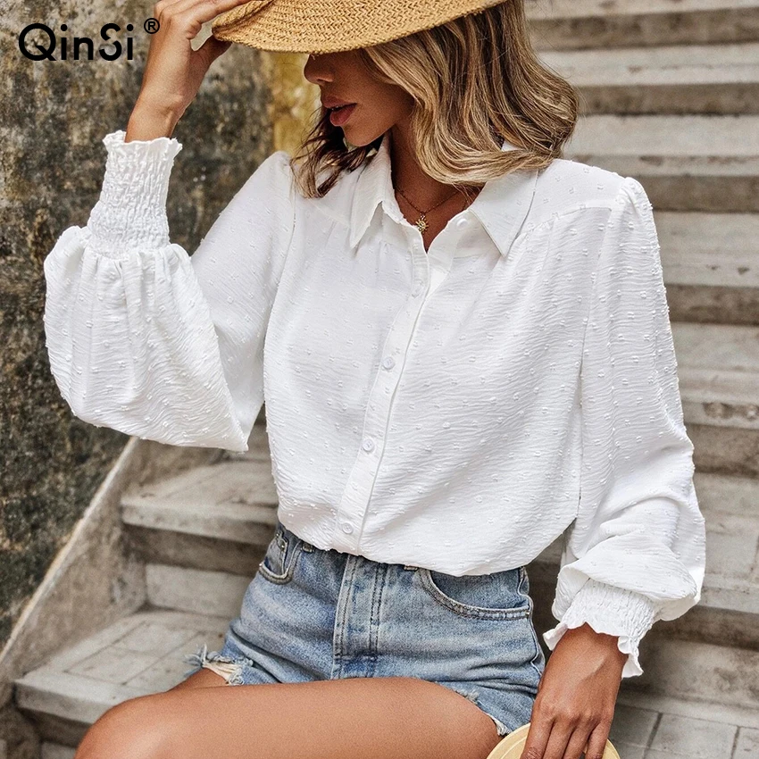 Bclout/QINSI Solid Vintage Blouse Women Tops Shirt Single Breasted Stand Collar Shirts Office Work Blouse New In Lantern Sleeve