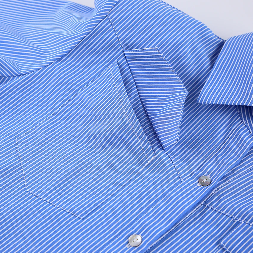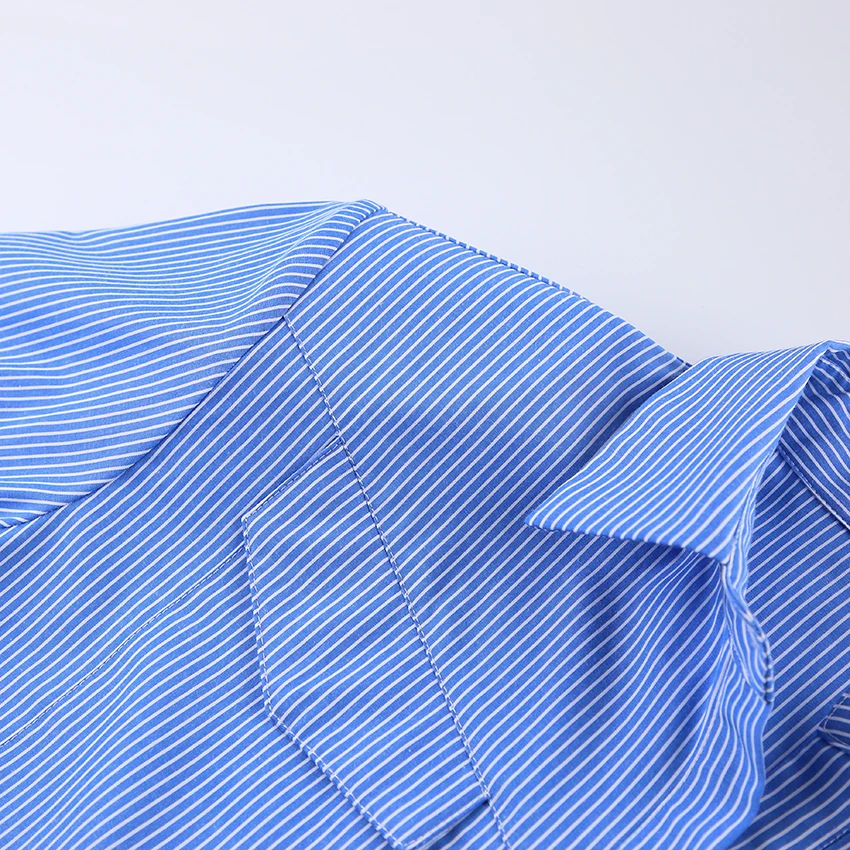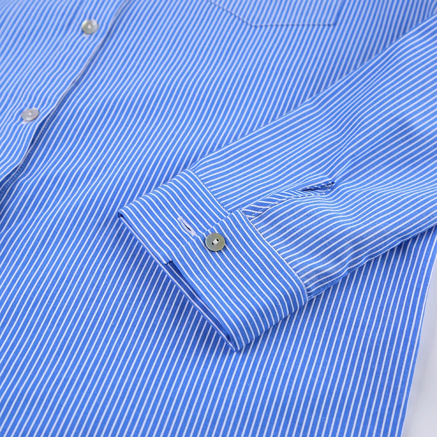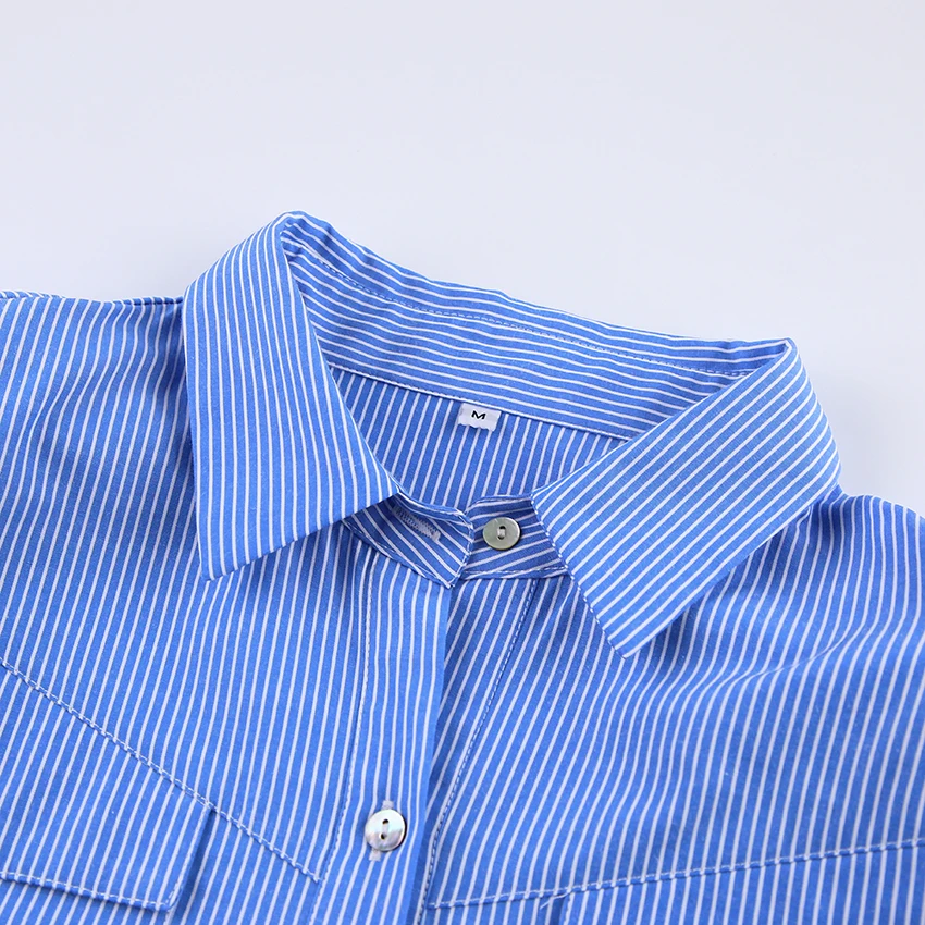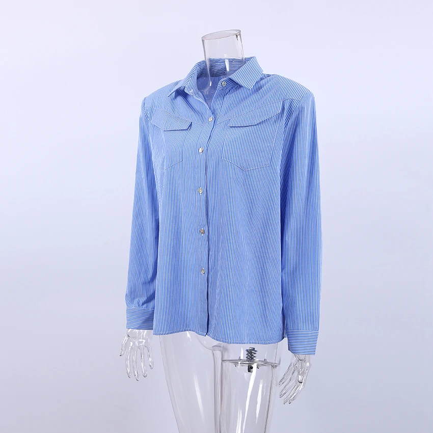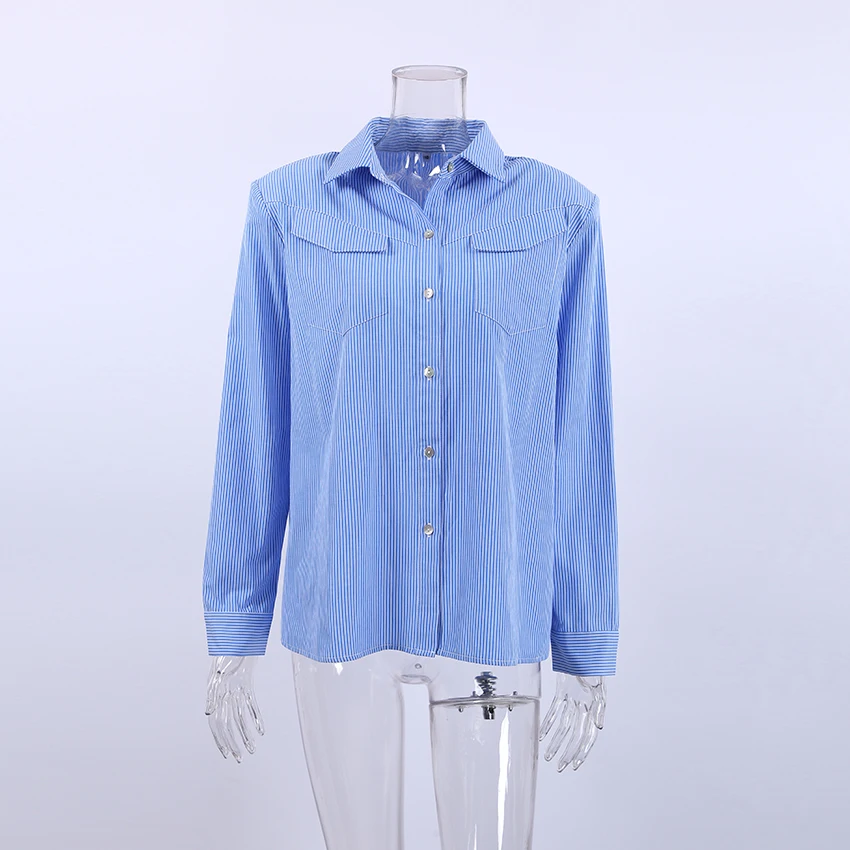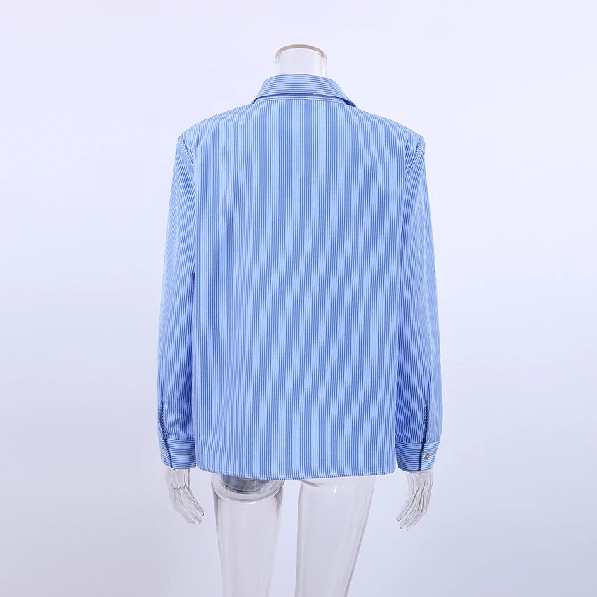 Bclout/QINSI Streak Chic Tops Woman Fashion Office Ladies Blue Lapel Blouses With Shoulder Pads Long Sleeves Stripe Shirts