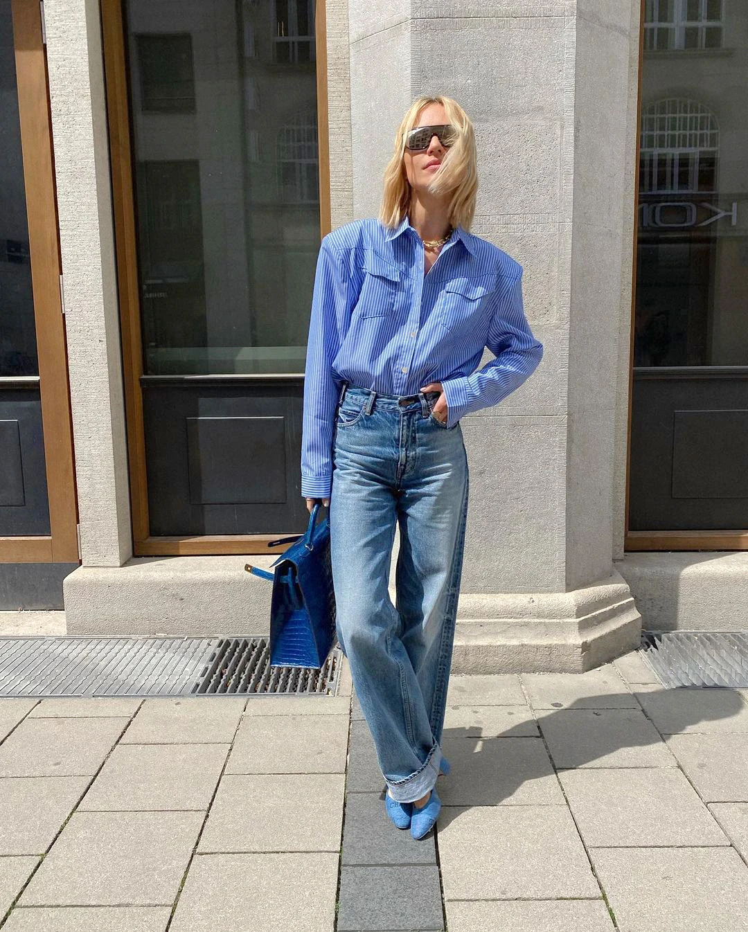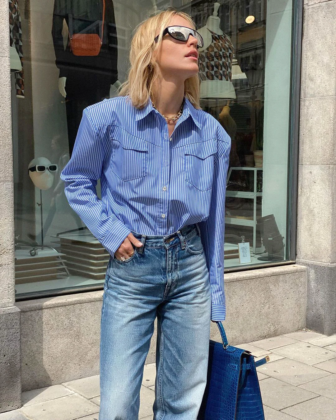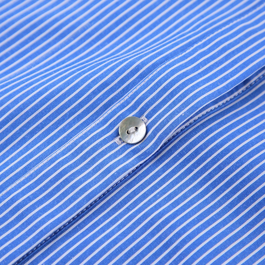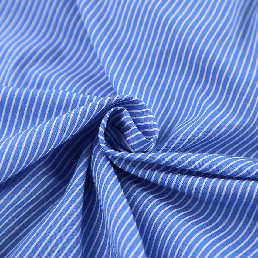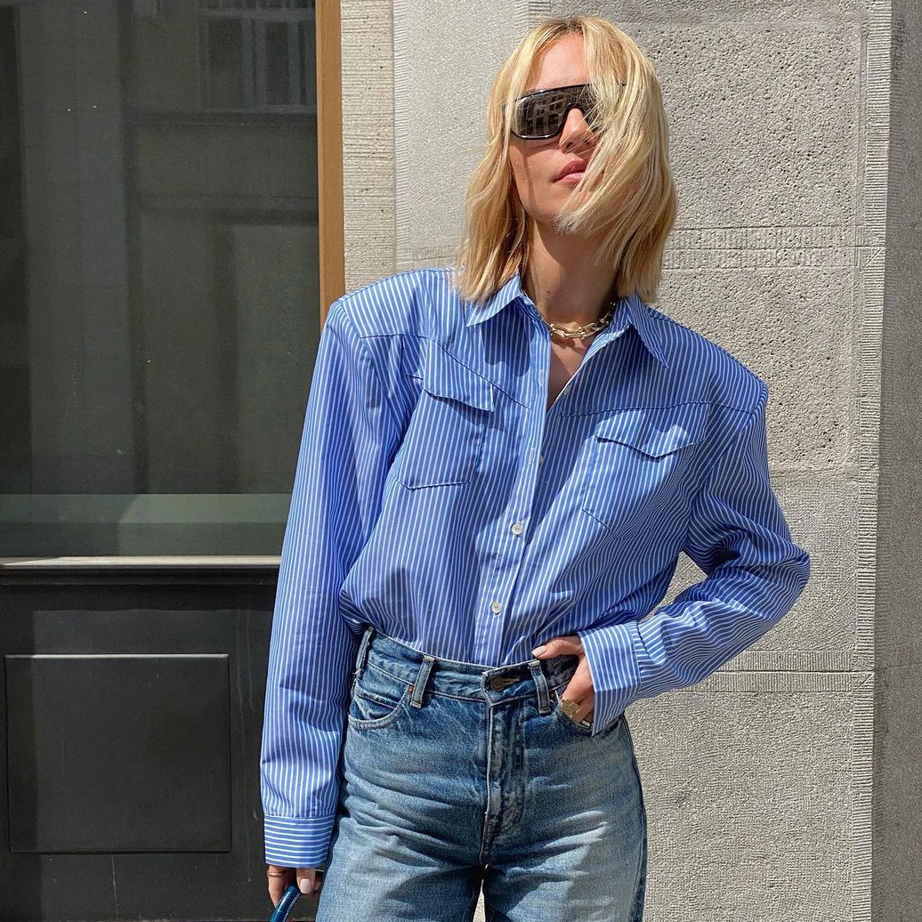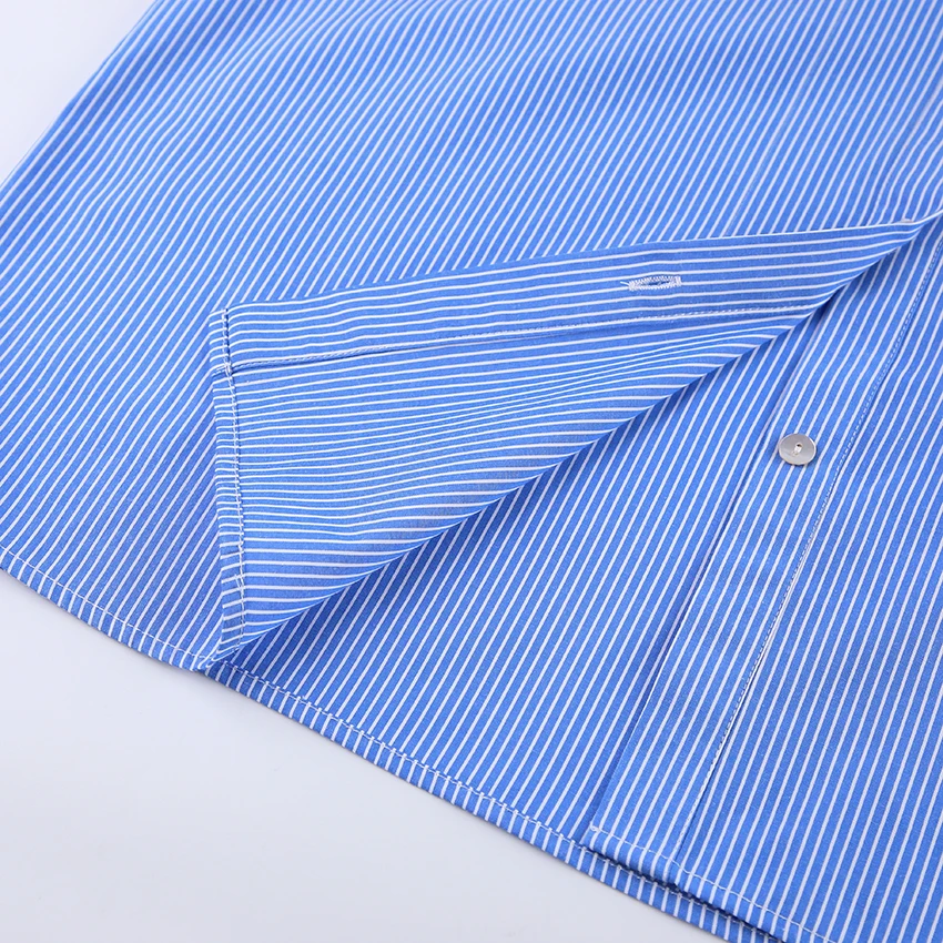 Bclout/QINSI Streak Chic Tops Woman Fashion Office Ladies Blue Lapel Blouses With Shoulder Pads Long Sleeves Stripe Shirts