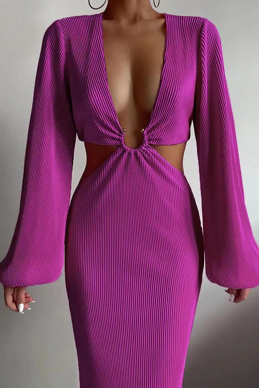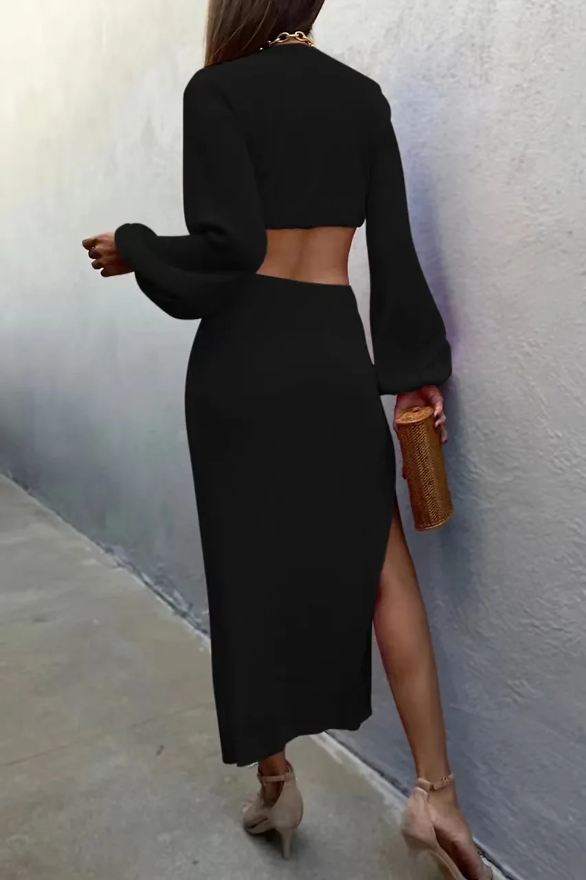 Bclout Split Cut Out Summer Dress Elegant Deep V Neck Lantern Sleeve High Casual Beachwear 2023 Autumn Sexy Y2K Maxi Dresses