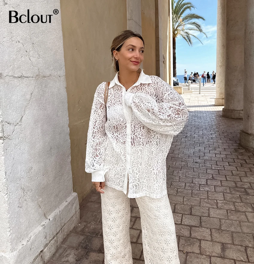 Bclout Turn Down Collar Woman Blouses 2023 Summer Cotton Hollow Out Street Chic Tops Elegant Lace Long Sleeve White Shirts
