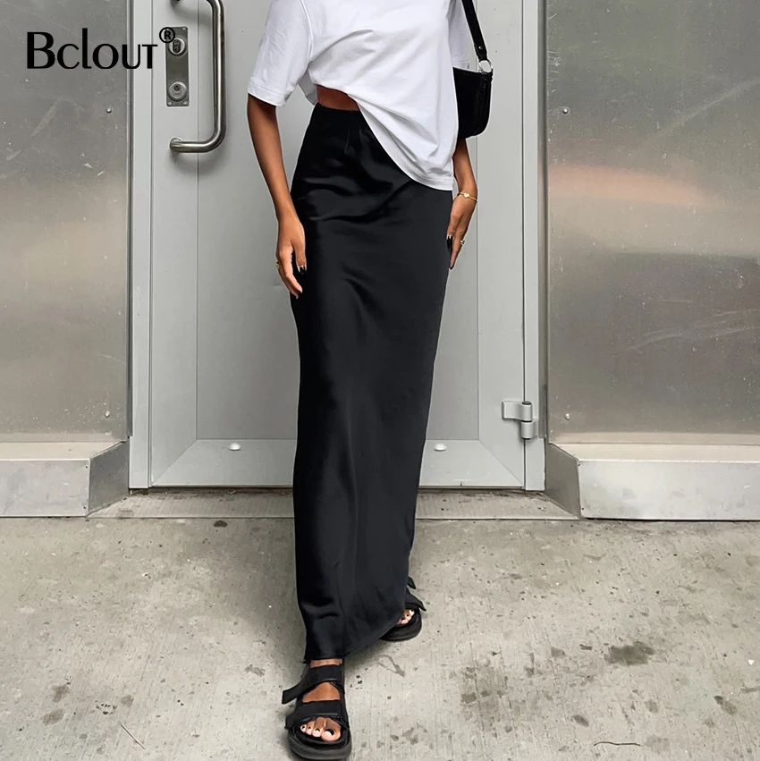 Bclout Women Spring Summer Solid Office Long Skirt Female 2023 Slim High Waist Skirts Fashion Elegant Satin Black Trumpet Skirts