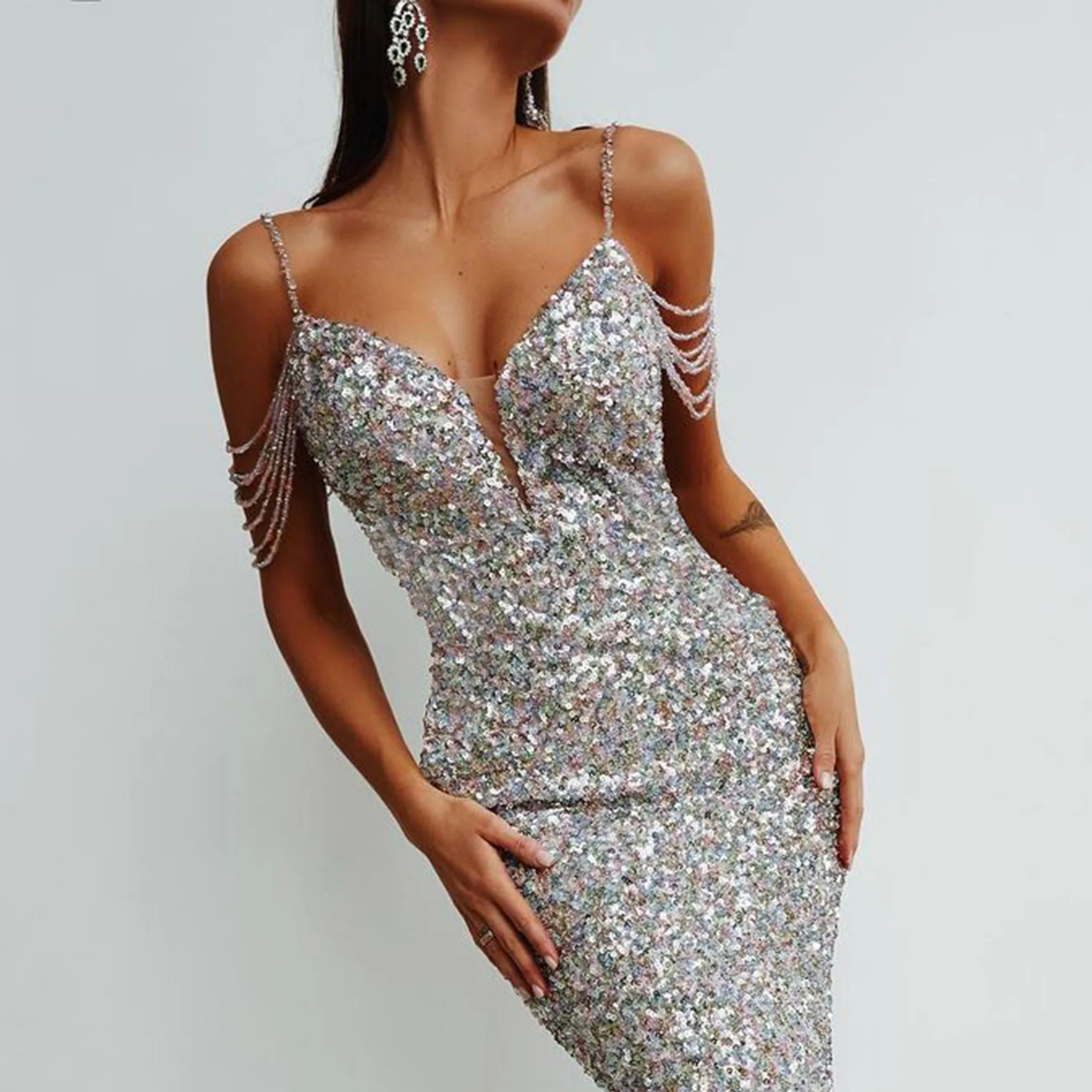 Fashion New In Colorful Sequins V-neck Strap Long Dress For Women