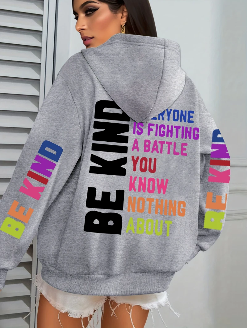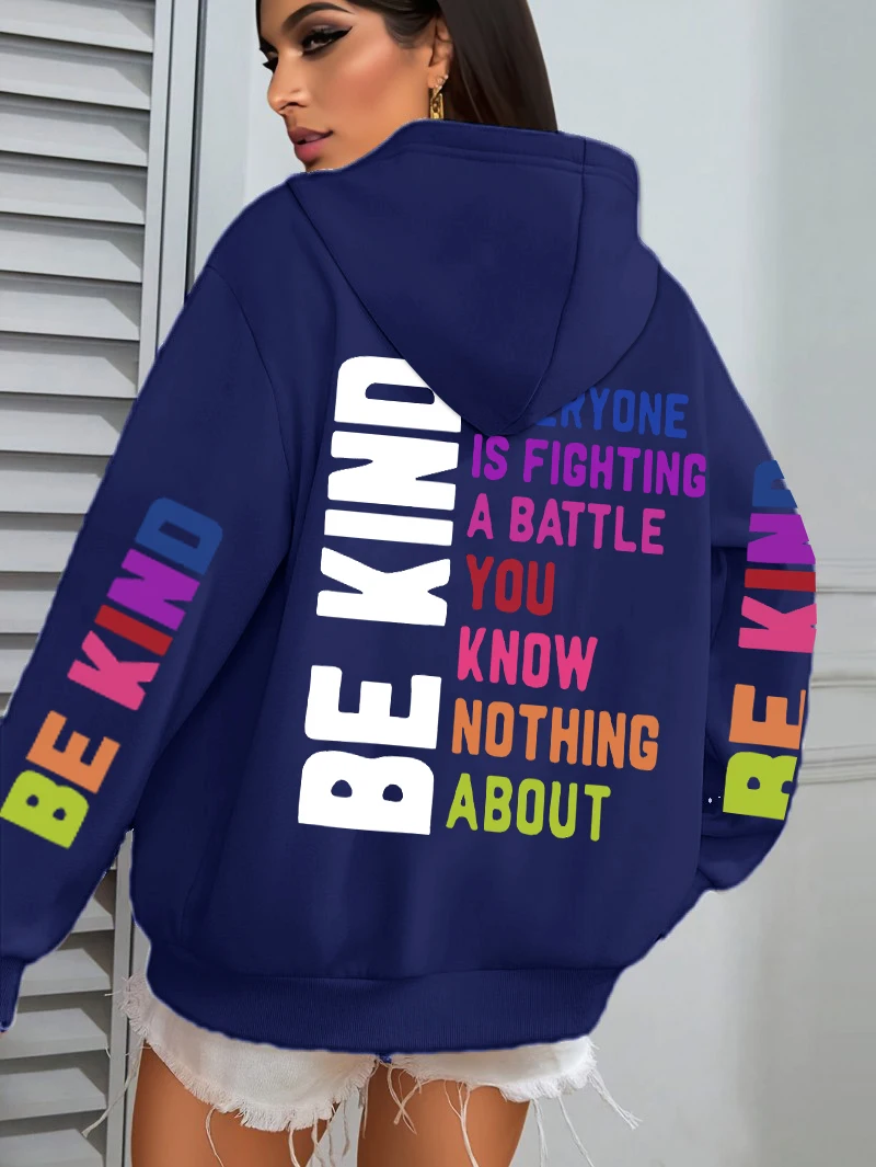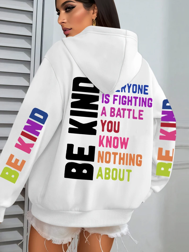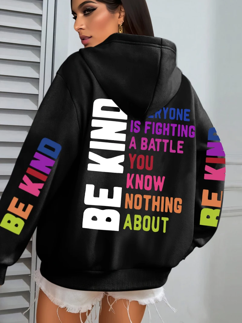 Be Kind Hoodies Women Letter Prints Winter Fleece Warm Hooded Street Pocket Loose Sweatshirts Casual All-match Woman Clothes