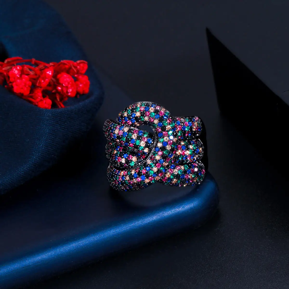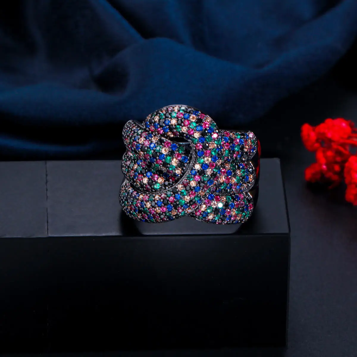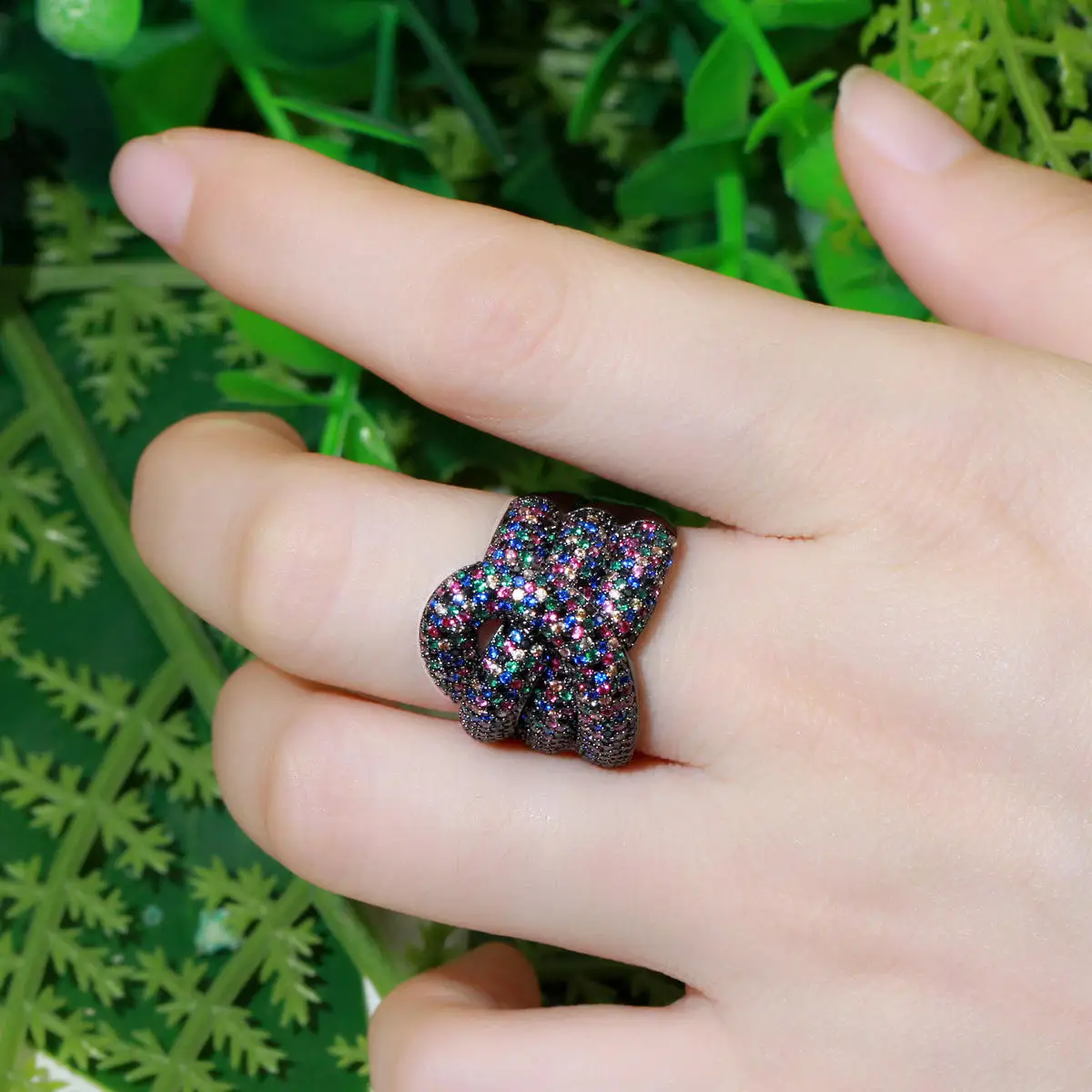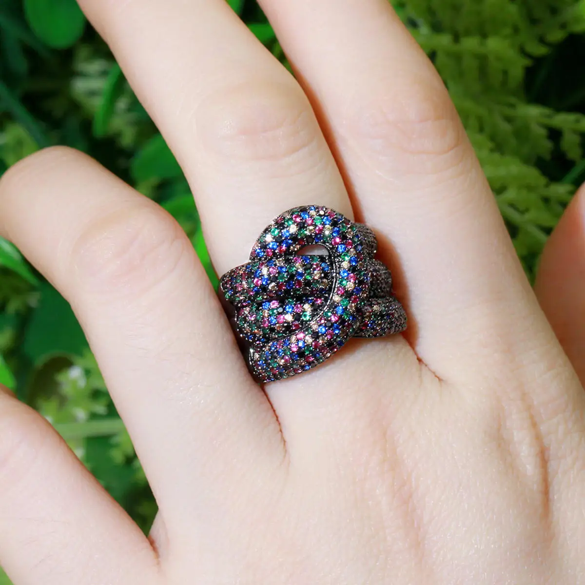 Beautiful Design 3 Lines Weave Cross Black Gun Plated Round CZ Snake Shape Finger Cocktail Rings for Women Female