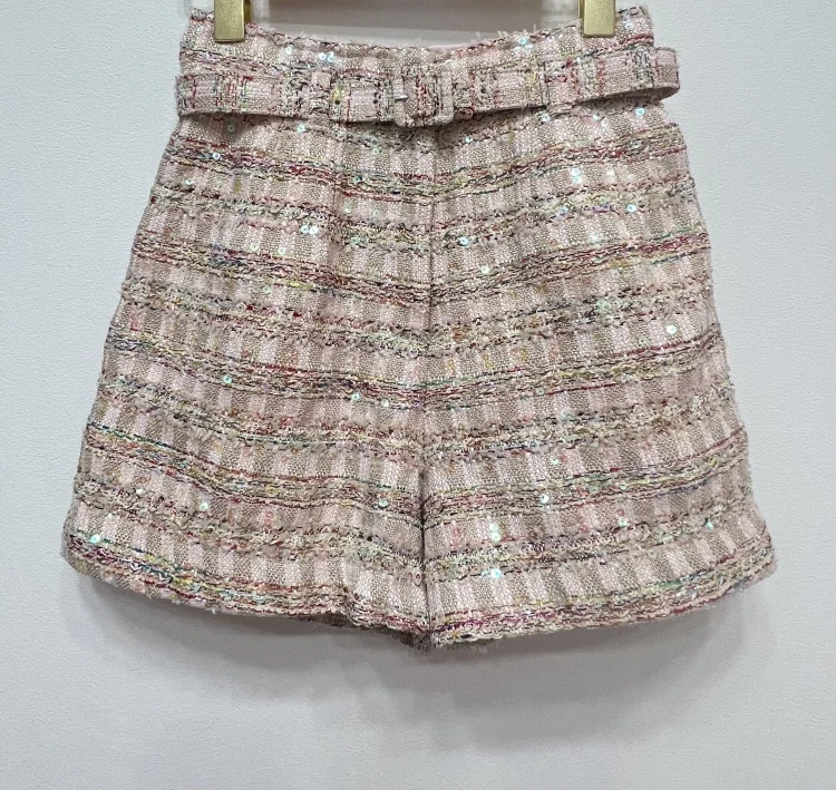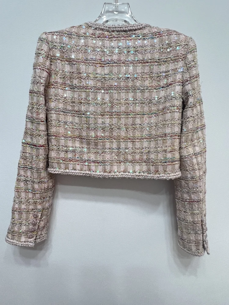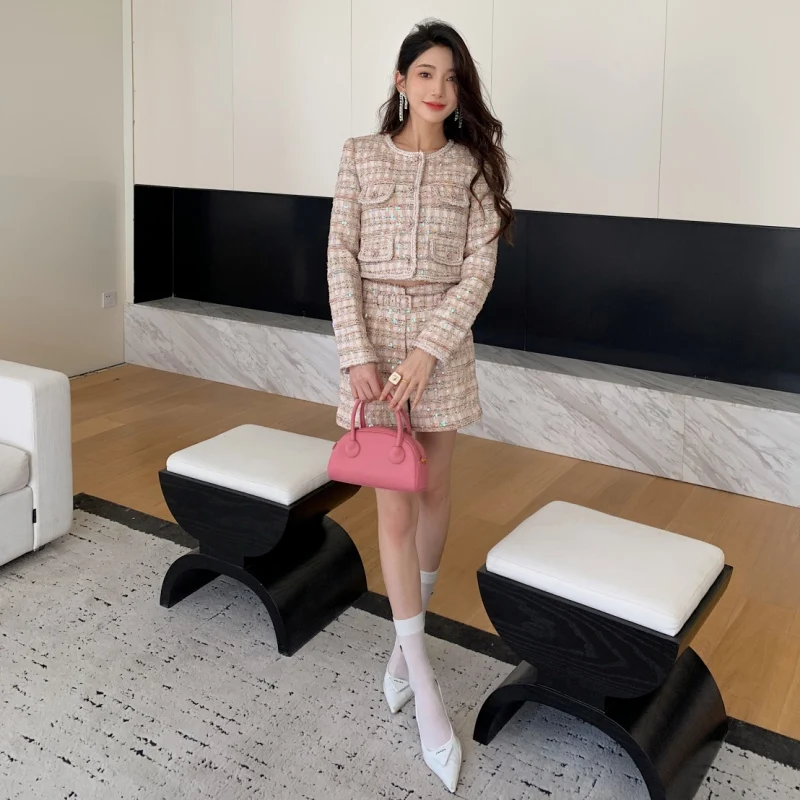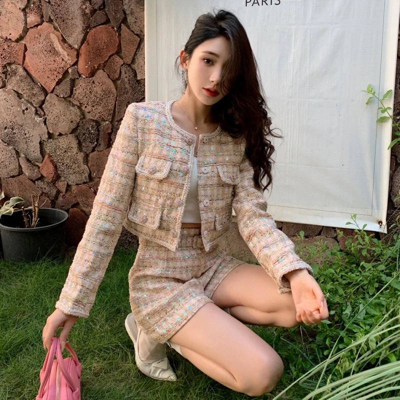 Bettergirl 2023 Autumn Tweed Suit Temperament Sweet Cool Sequin Long Sleeve Crew Neck Top Coat Pants Suit