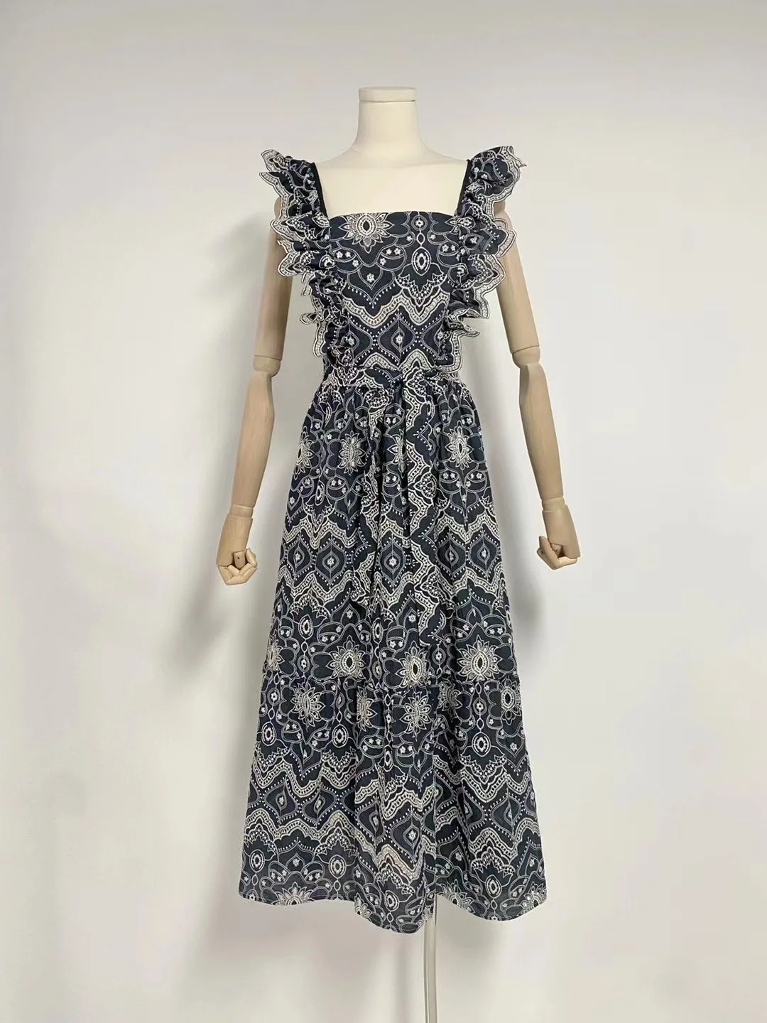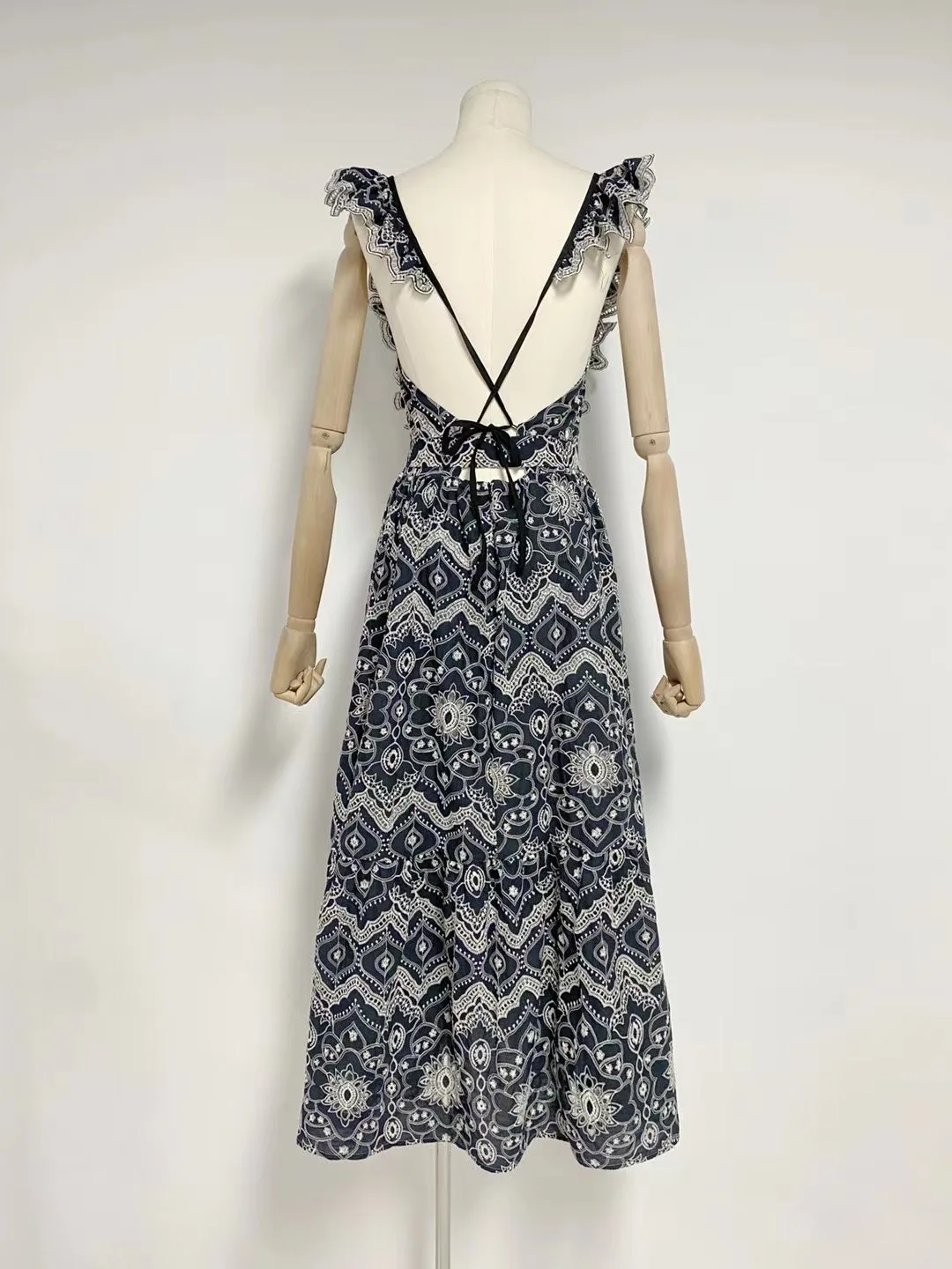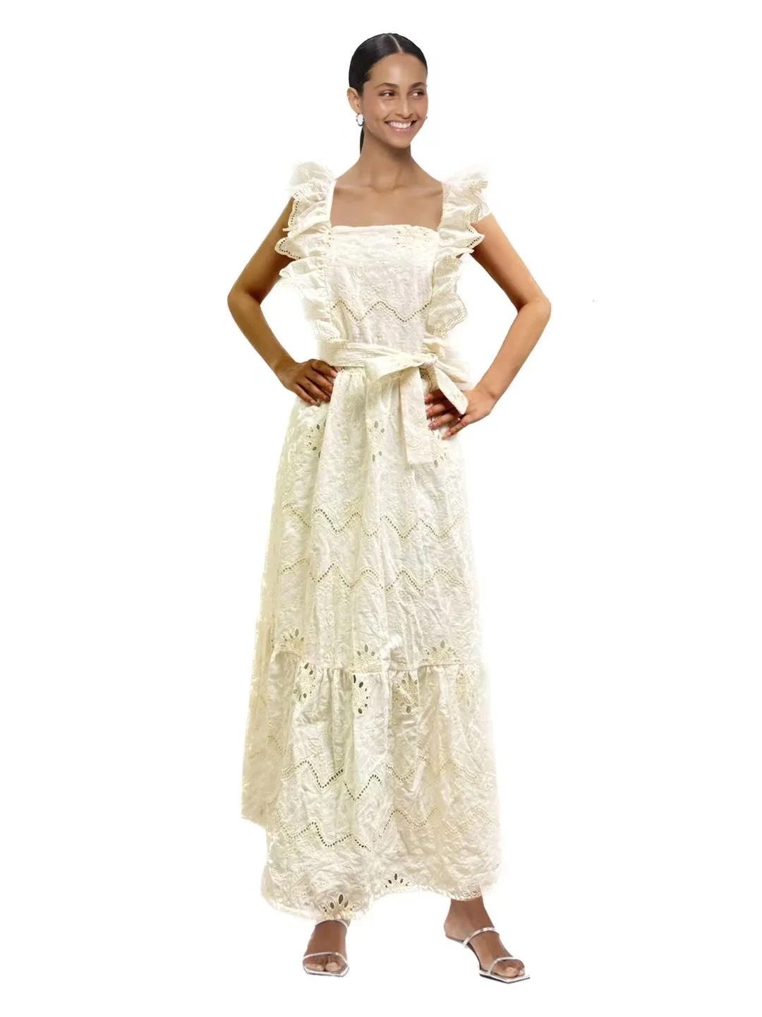 Bettergirl Cross Binding Backless Hollow Out Applique Frilly Square Collar Lace Pattern Sexy Elegant Sleeveless Casual Dresses