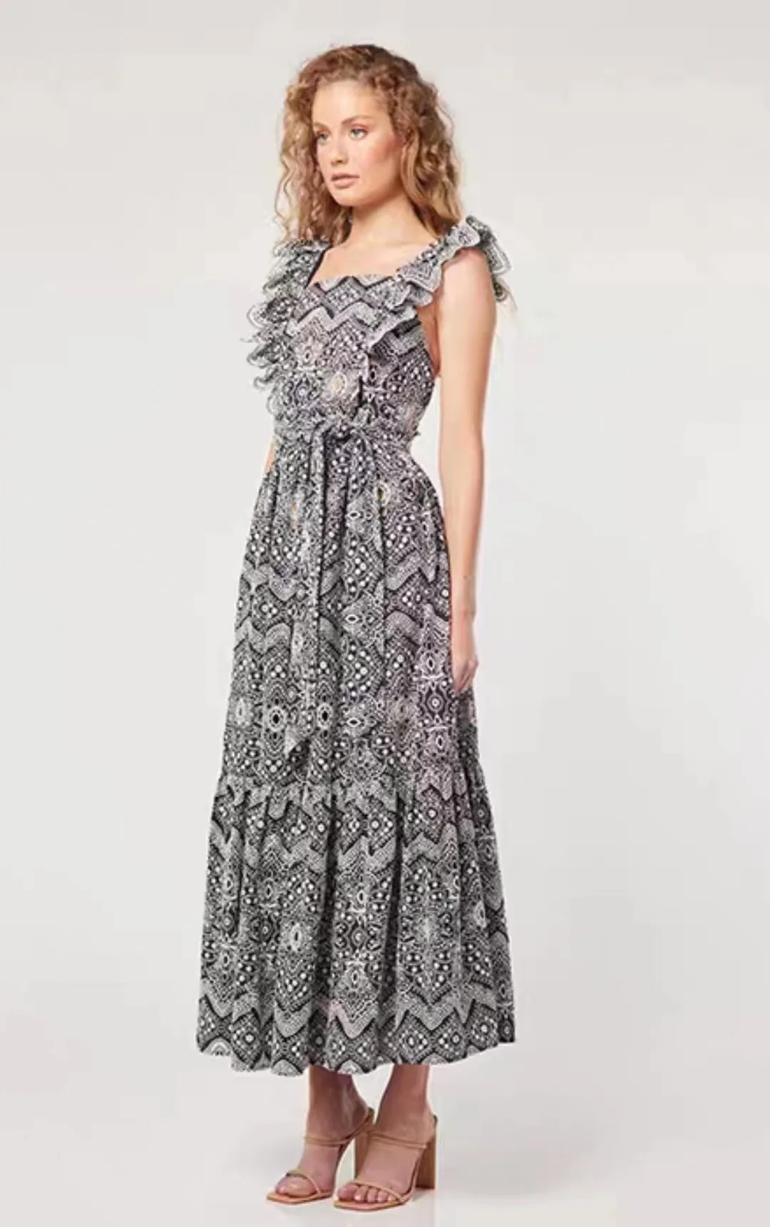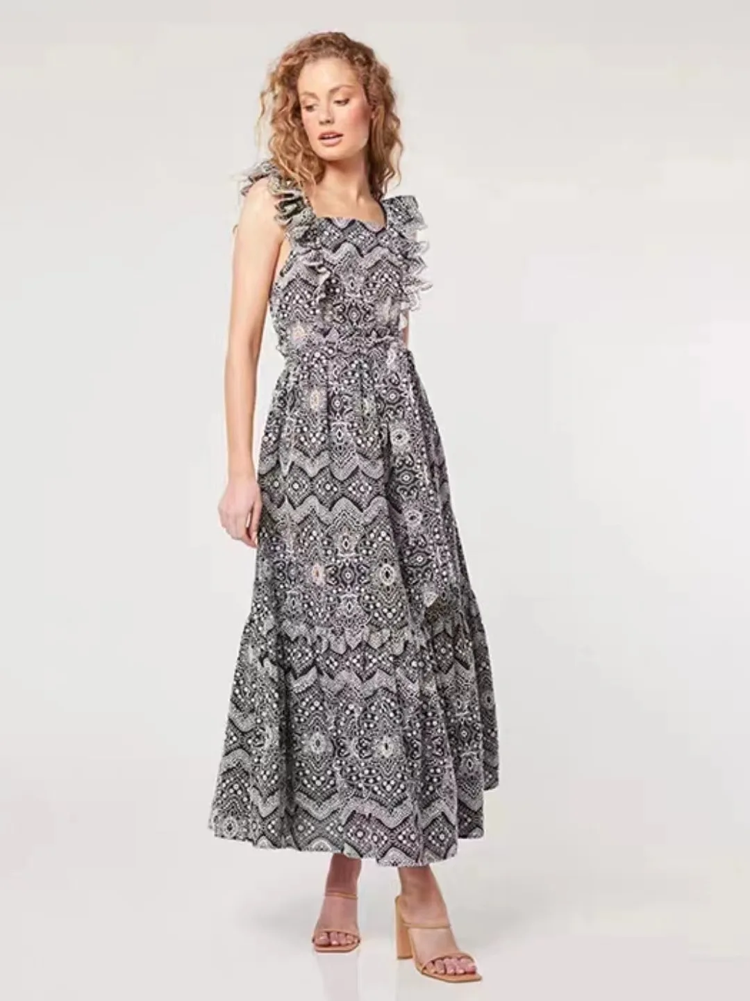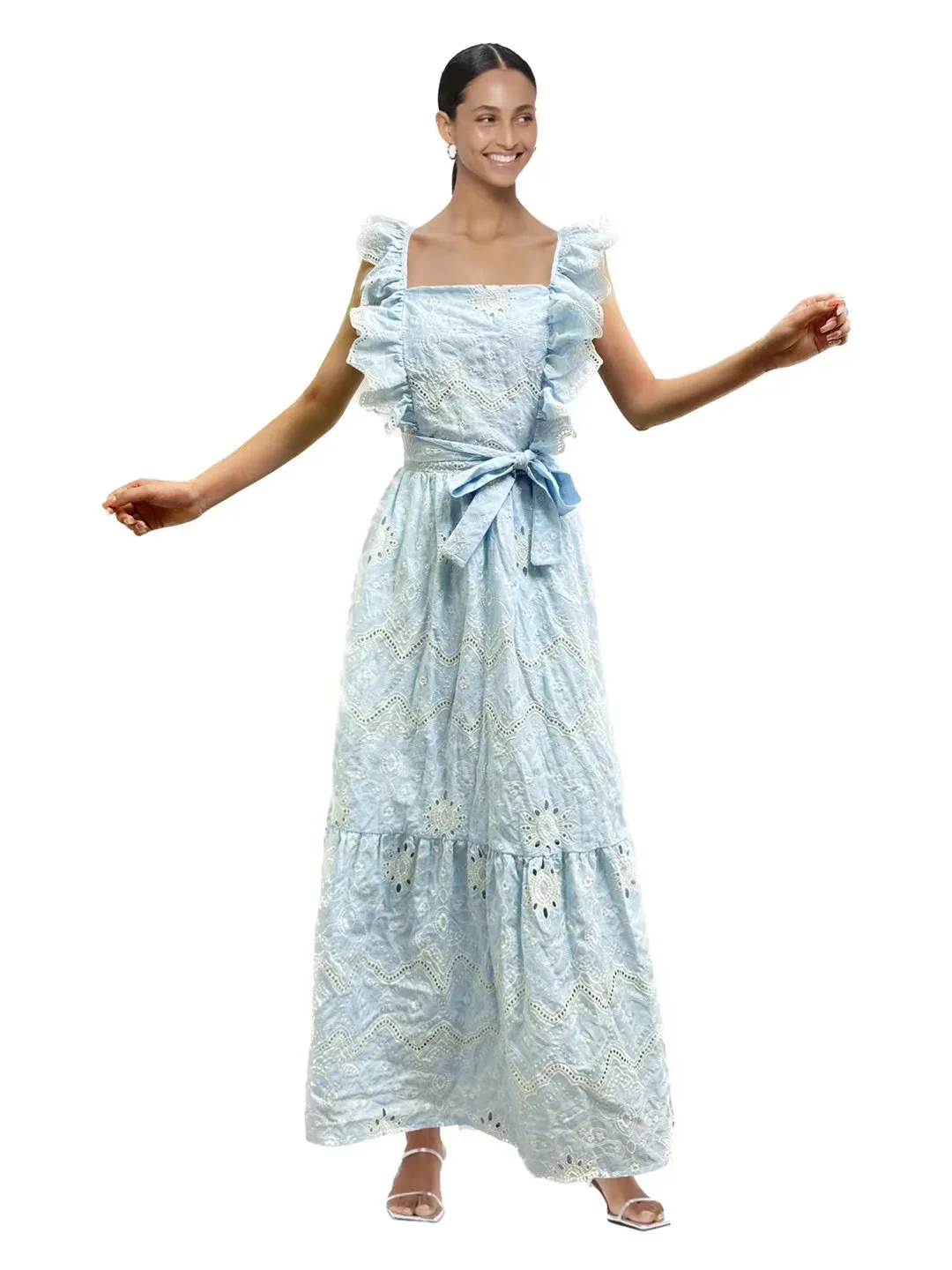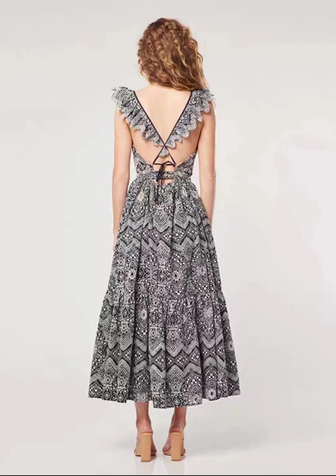 Bettergirl Cross Binding Backless Hollow Out Applique Frilly Square Collar Lace Pattern Sexy Elegant Sleeveless Casual Dresses