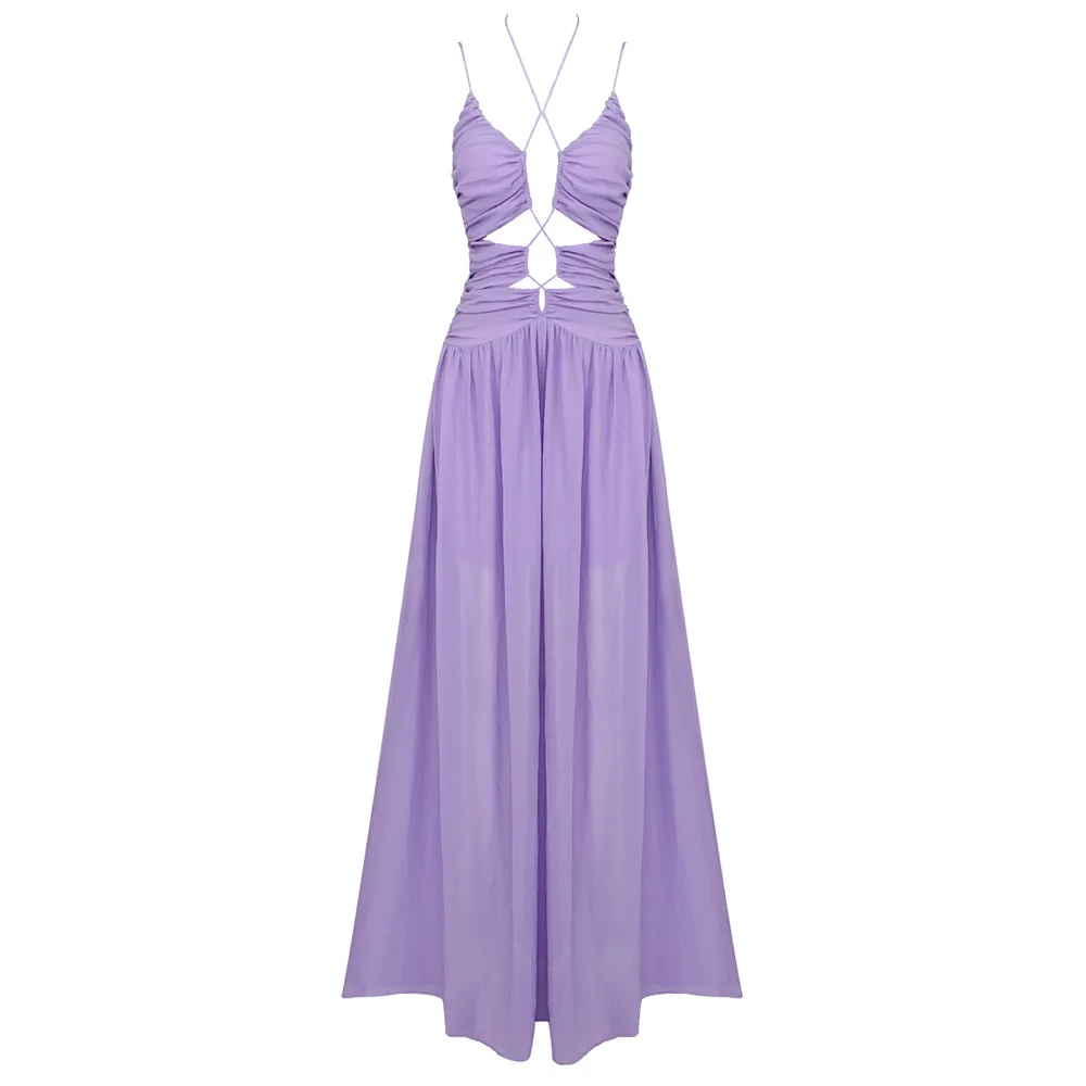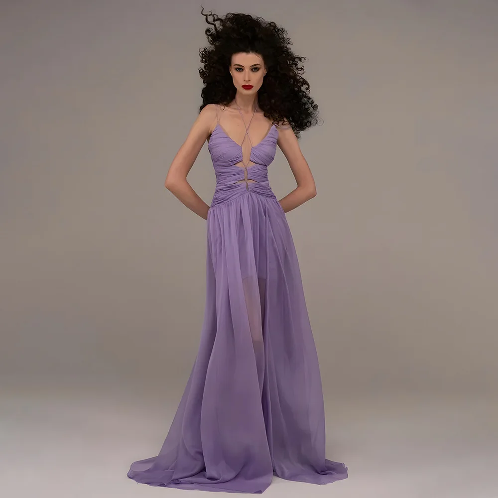 Bettergirl fashion High Quality Hollow Elegant Dress 2023 Autumn Purple Chiffon Pleated Sexy Translucent Halter Women's Dresses