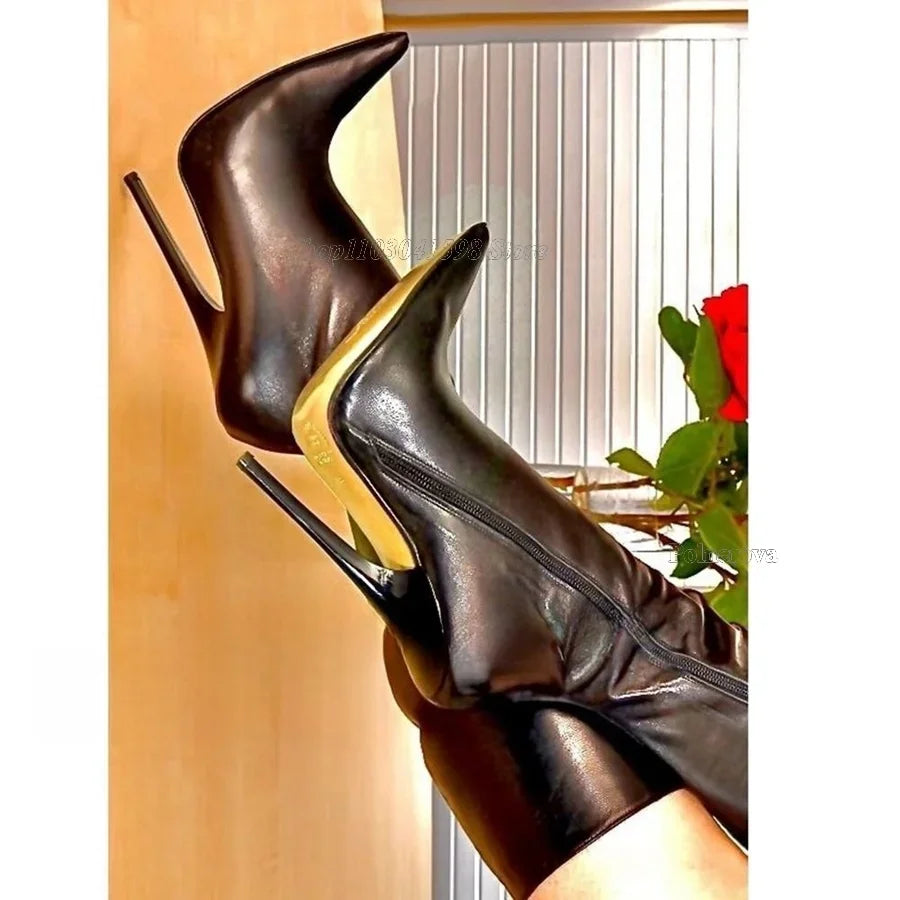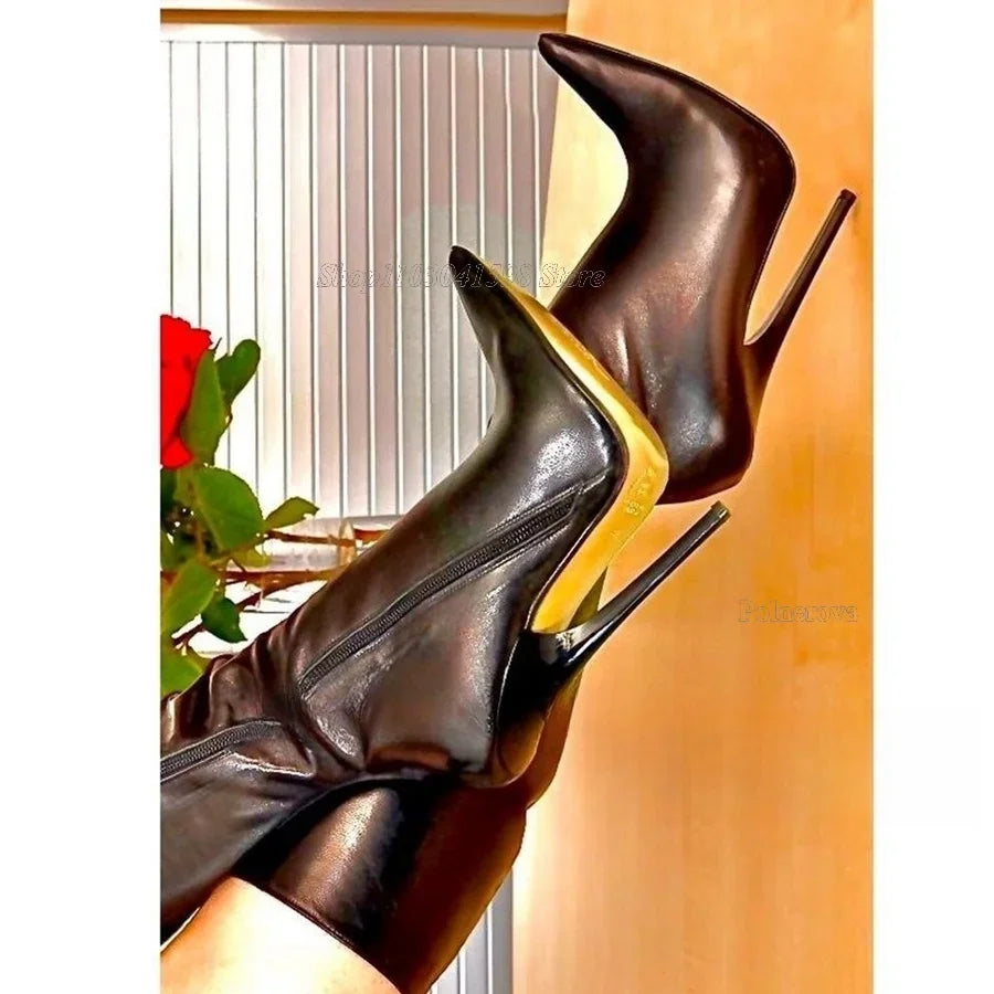 Black Leather Calf Boots Fall New Zipper Women Boots Fine Heel Pointed Toe Boots High Heels Party Boots 2023 Zapatos Para Mujere