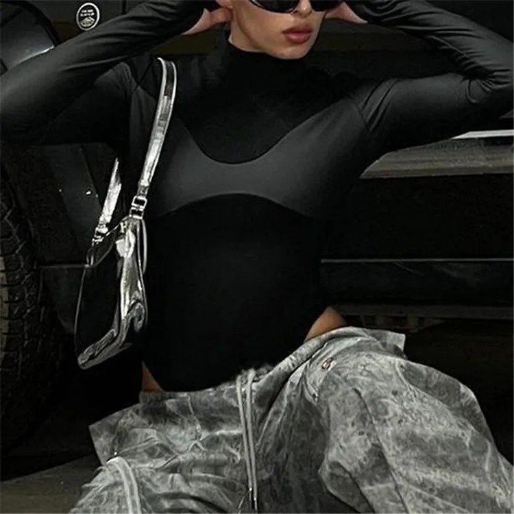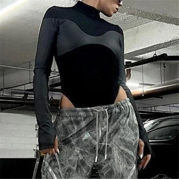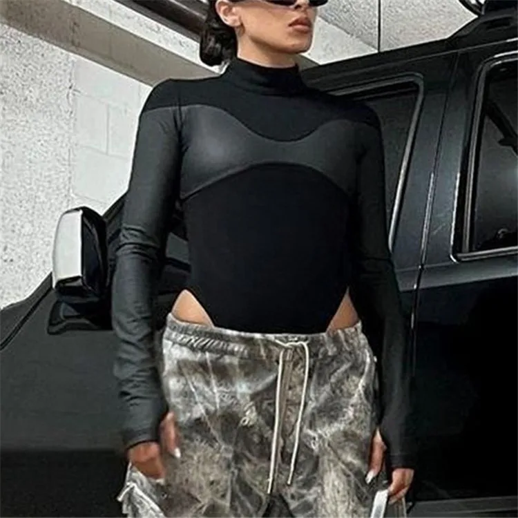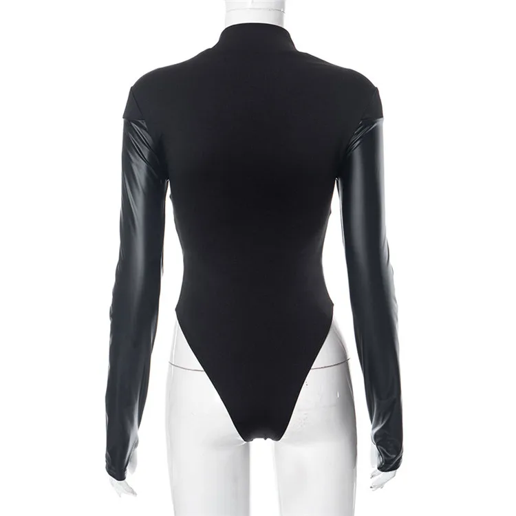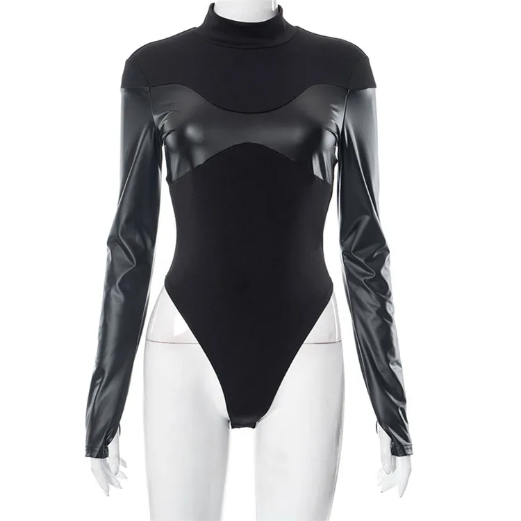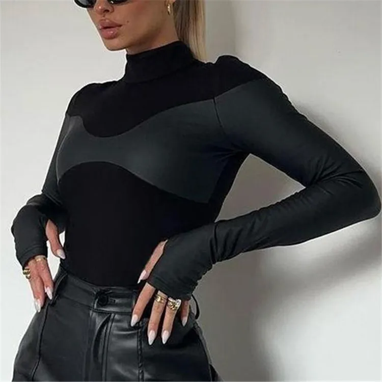 Black Patchwork Skinny Bodysuits Women PU Leather Full Sleeve Basic Elegant T-Shirt Tees Autumn