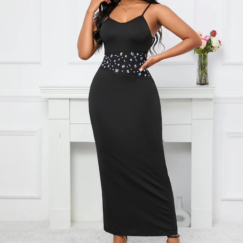 Black Sleeveless Rivet Sashes Split Sexy Strap Lady Club Dress