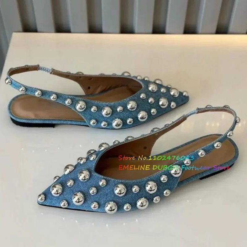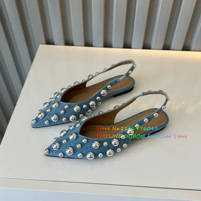 Blue Denim Bead Decoration Pumps Women Pointy Toe Slip On Solid Color Slingback Flat Shoes Ladies Summer New Handmade Sandals
