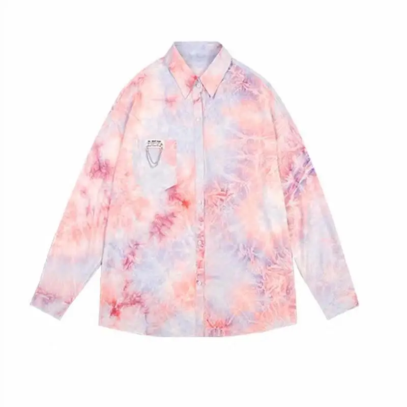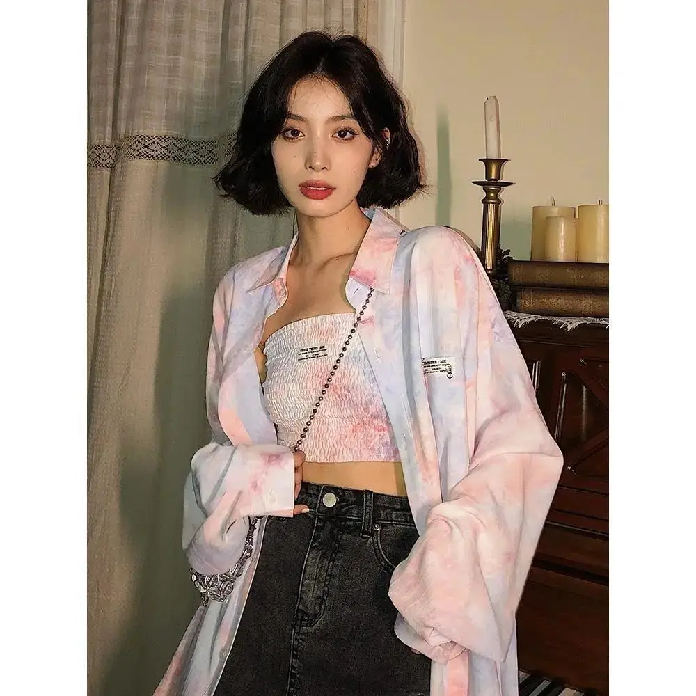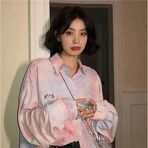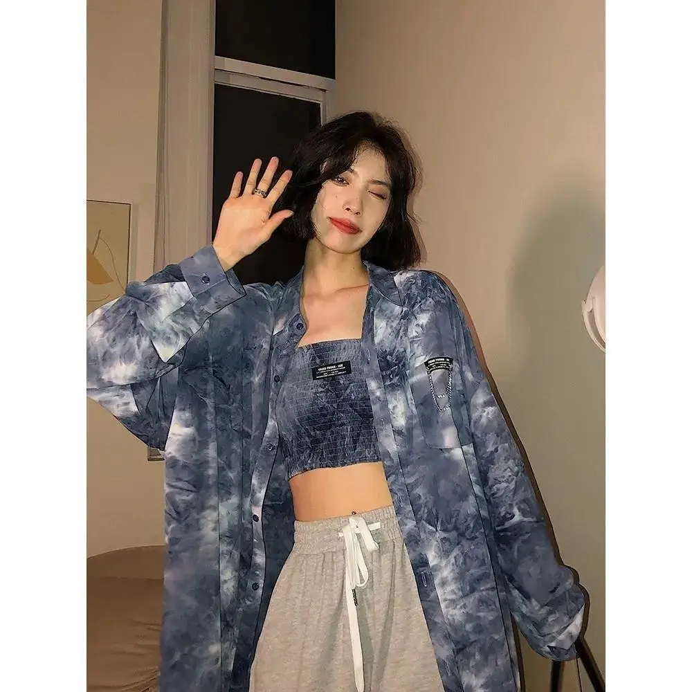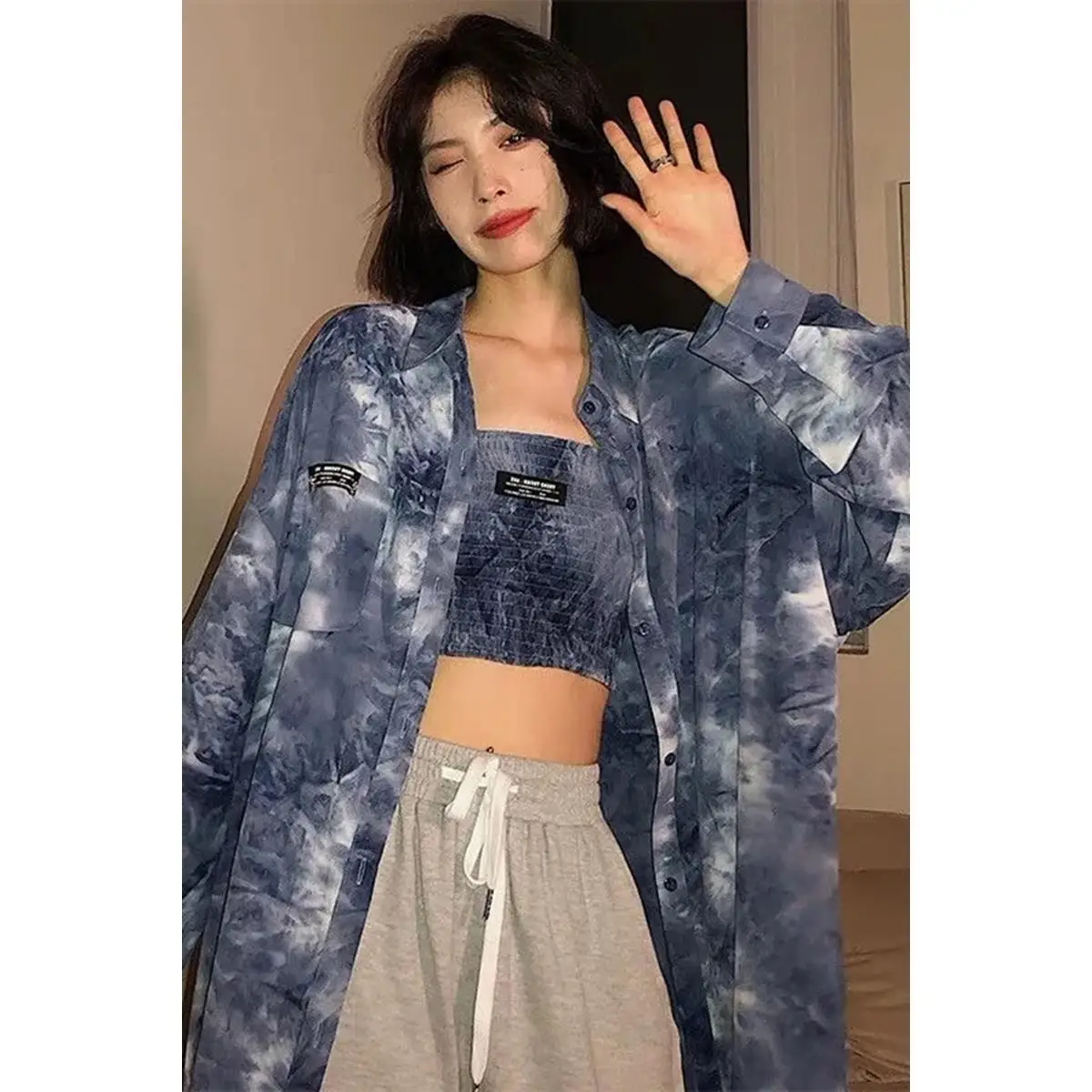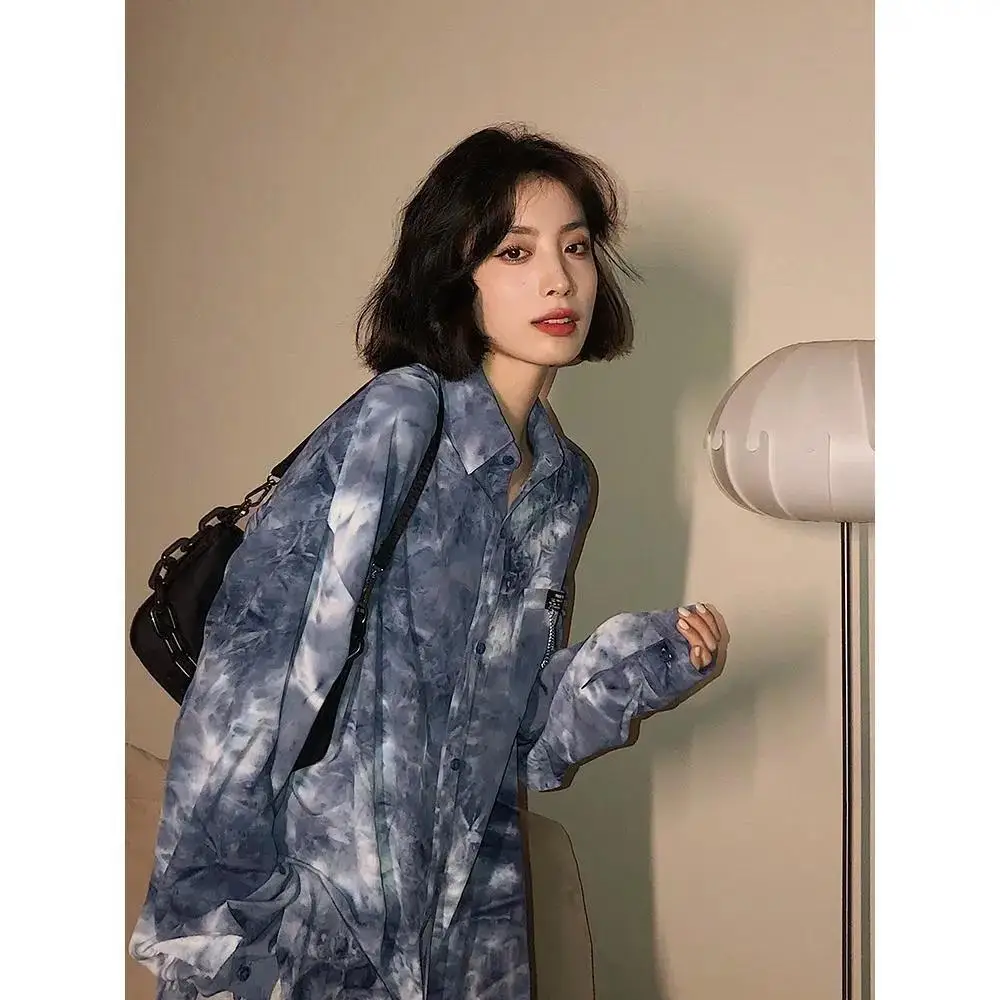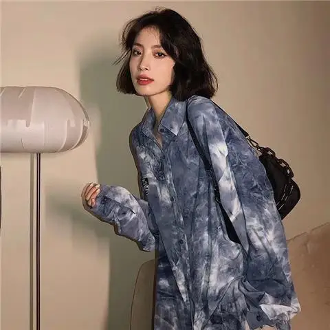 Blue Tie-Dye Fashion Long Sleeve Thin Shirt Women 2022 Spring Loose Retro Japanese Long Top New Women Clothing