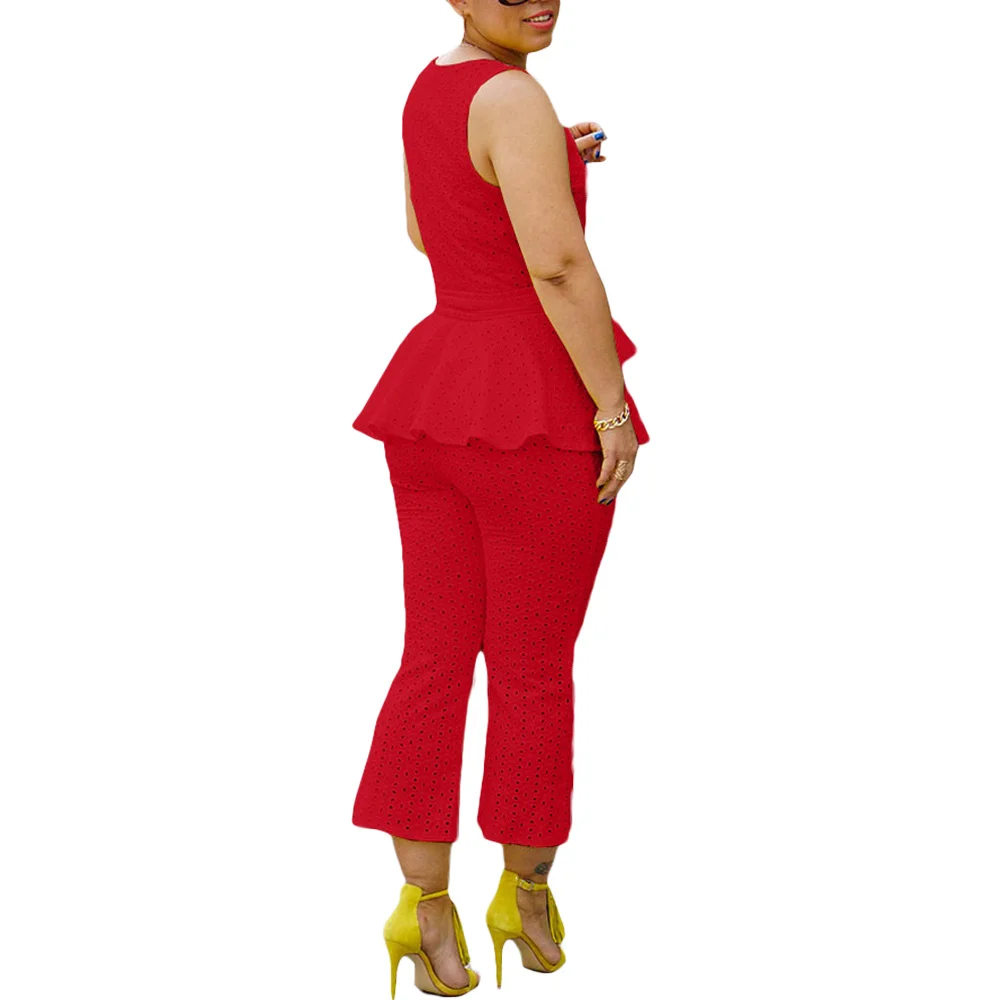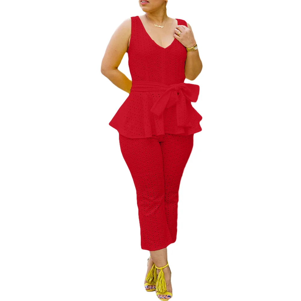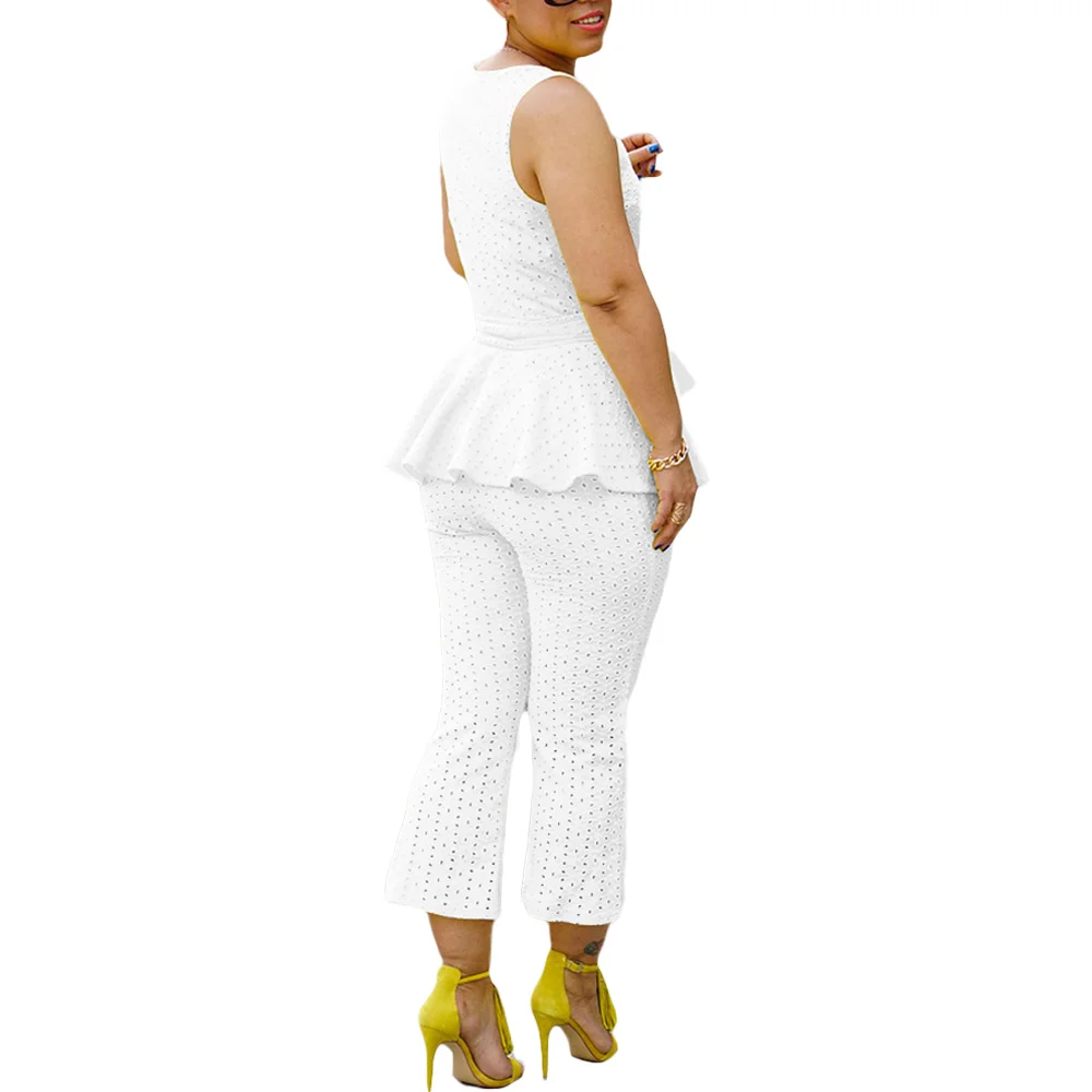 BN300 Solid Color Bandage Patchwork V-Neck Sleeveless Ruffle Hem Tank & Pant Set