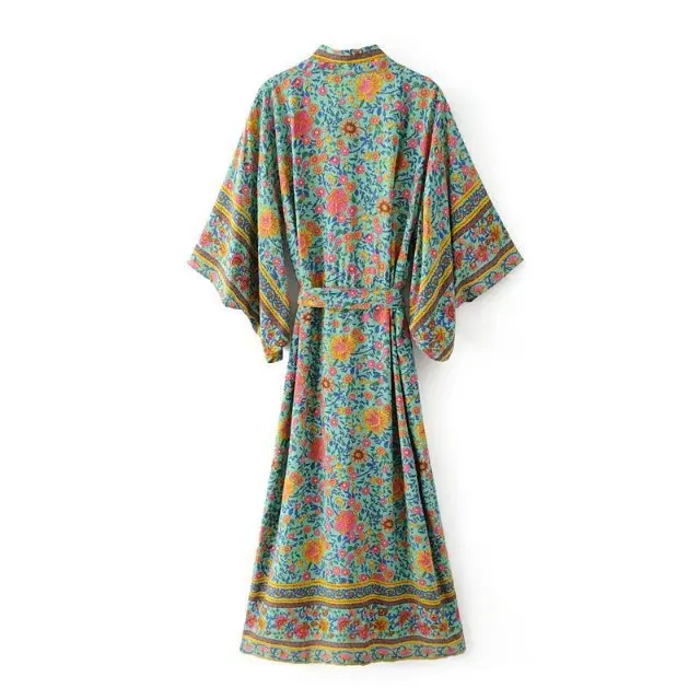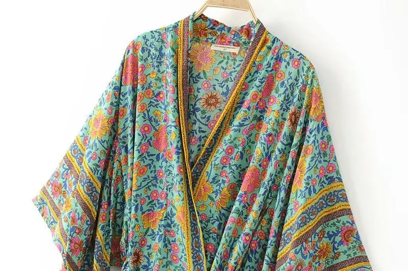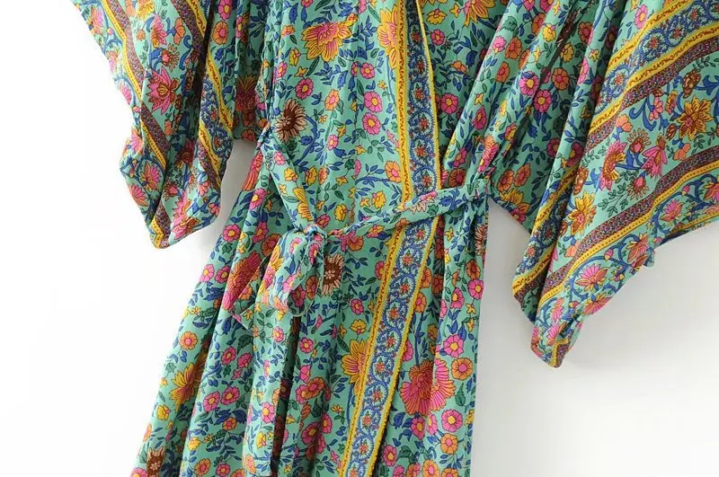 Bohemian Happy Kimono Batwing Sleeve Rayon Cotton Bohemian Beach Wear Bathing Suit Bikini Cover Ups Sashes Gypsy Vintage Robes