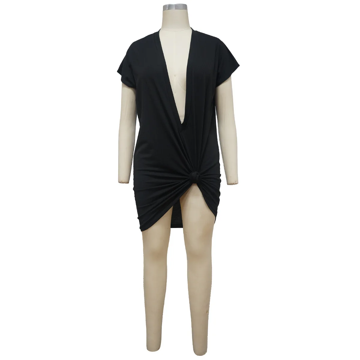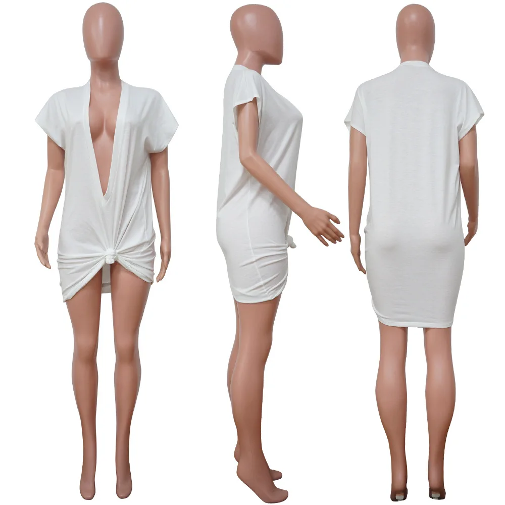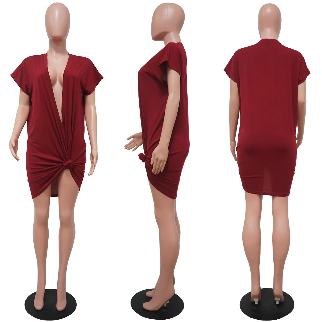 Bomblook C129DS Sexy Outfits Solid Women Party Club Dresses Short Sleeve Deep V Neck Mini Knotted Elegant Dress