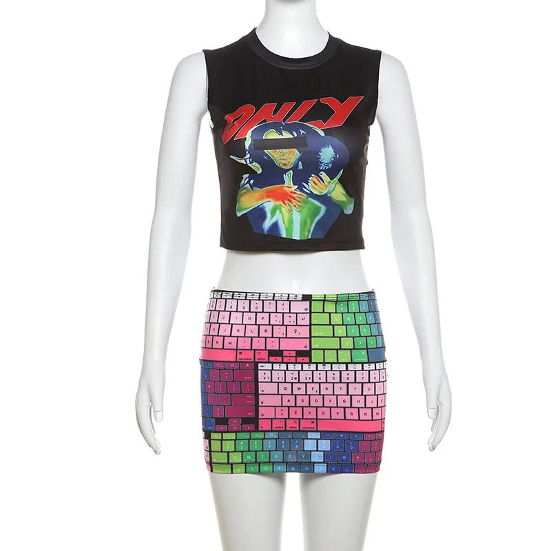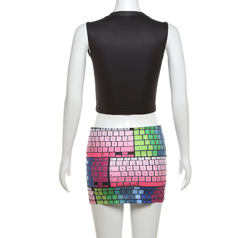 Bomblook C423ST Pattern Print Top With Keyboard Skirt Streetwear Tweed Set 3D Print 2 Piece Set Women Summer 2024 Suits