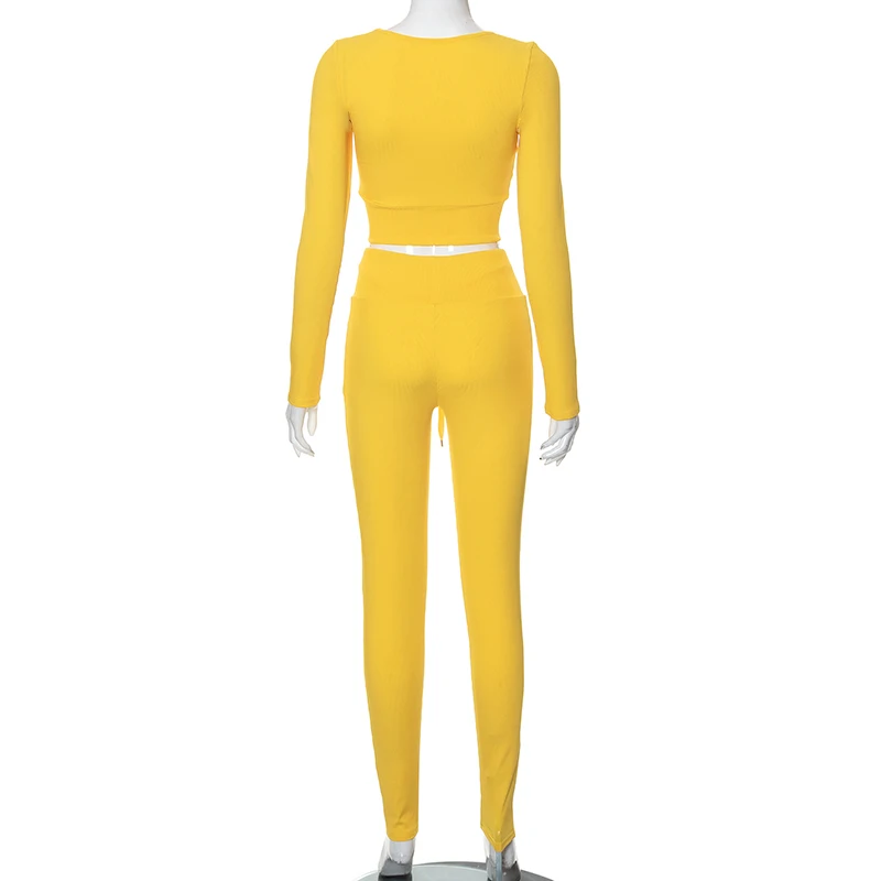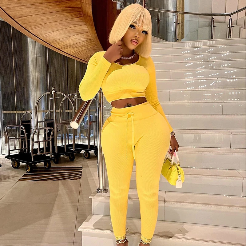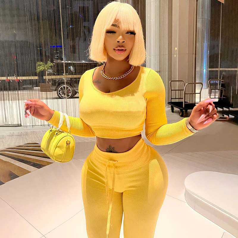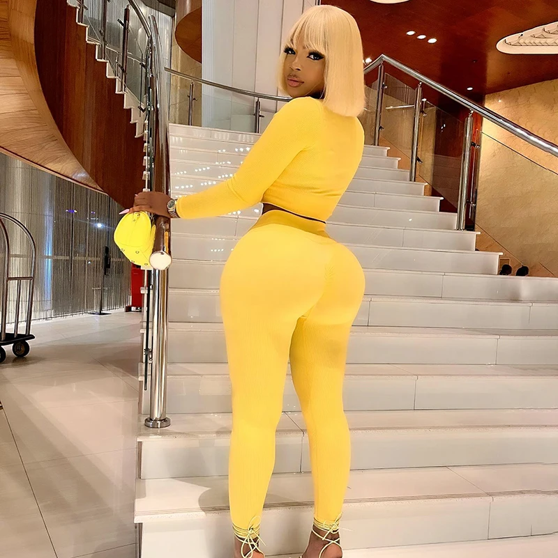 Bomblook K22ST459 Solid Color Fabric 2022 Women Two Piece Set Crop Top Fall Tight Outfits