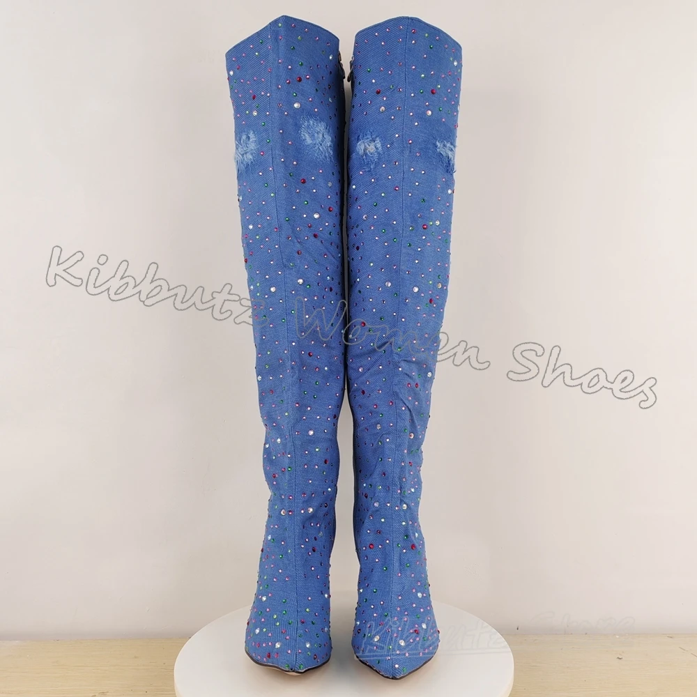 Boots Over The Knee Denim Cloth Crystal Glossy Rhinestone Slip-On Fashion Luxury Elegant Concise Sexy Spicy Girls Shoes Newest