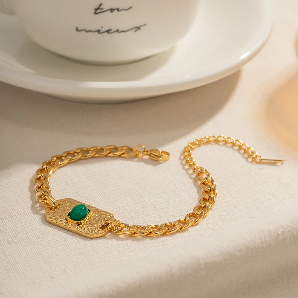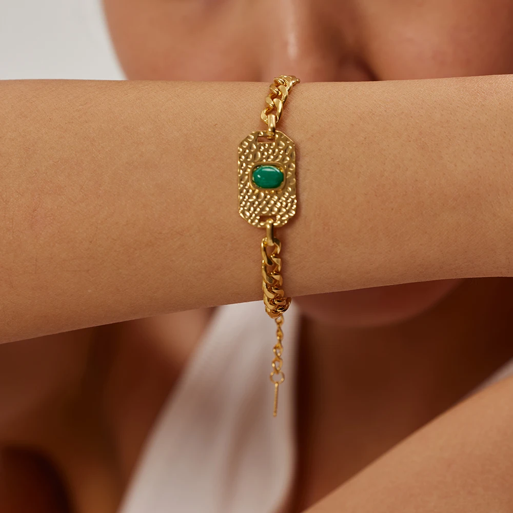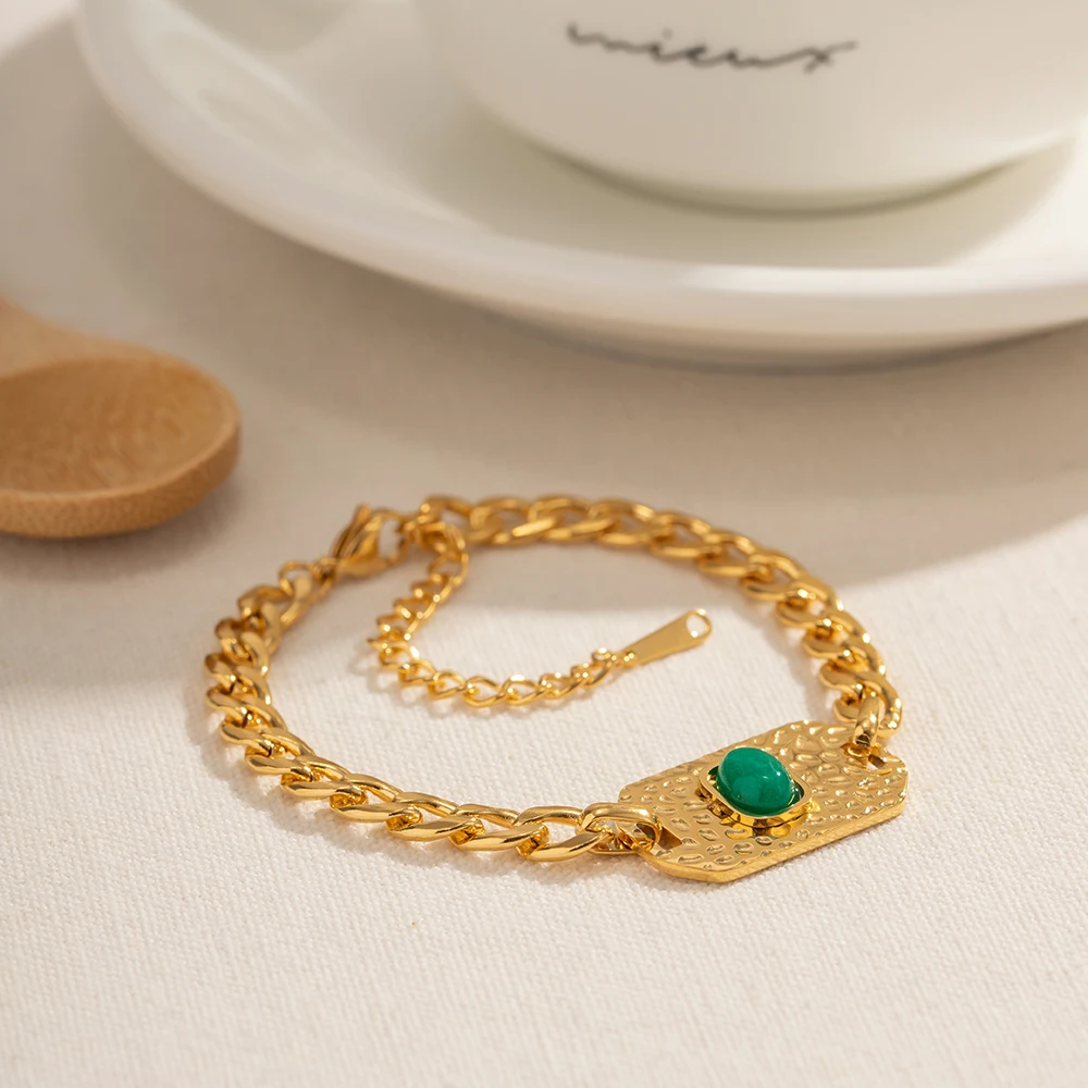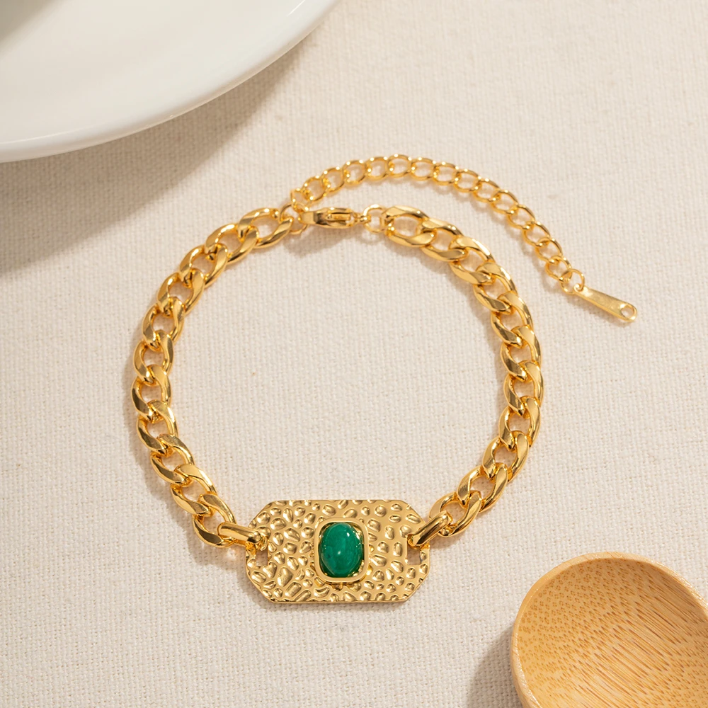 BR992 Fashion Jewelry 18k Gold Plated Stainless Steel Texture Oval Shape Green Stone Bracelet for Girls