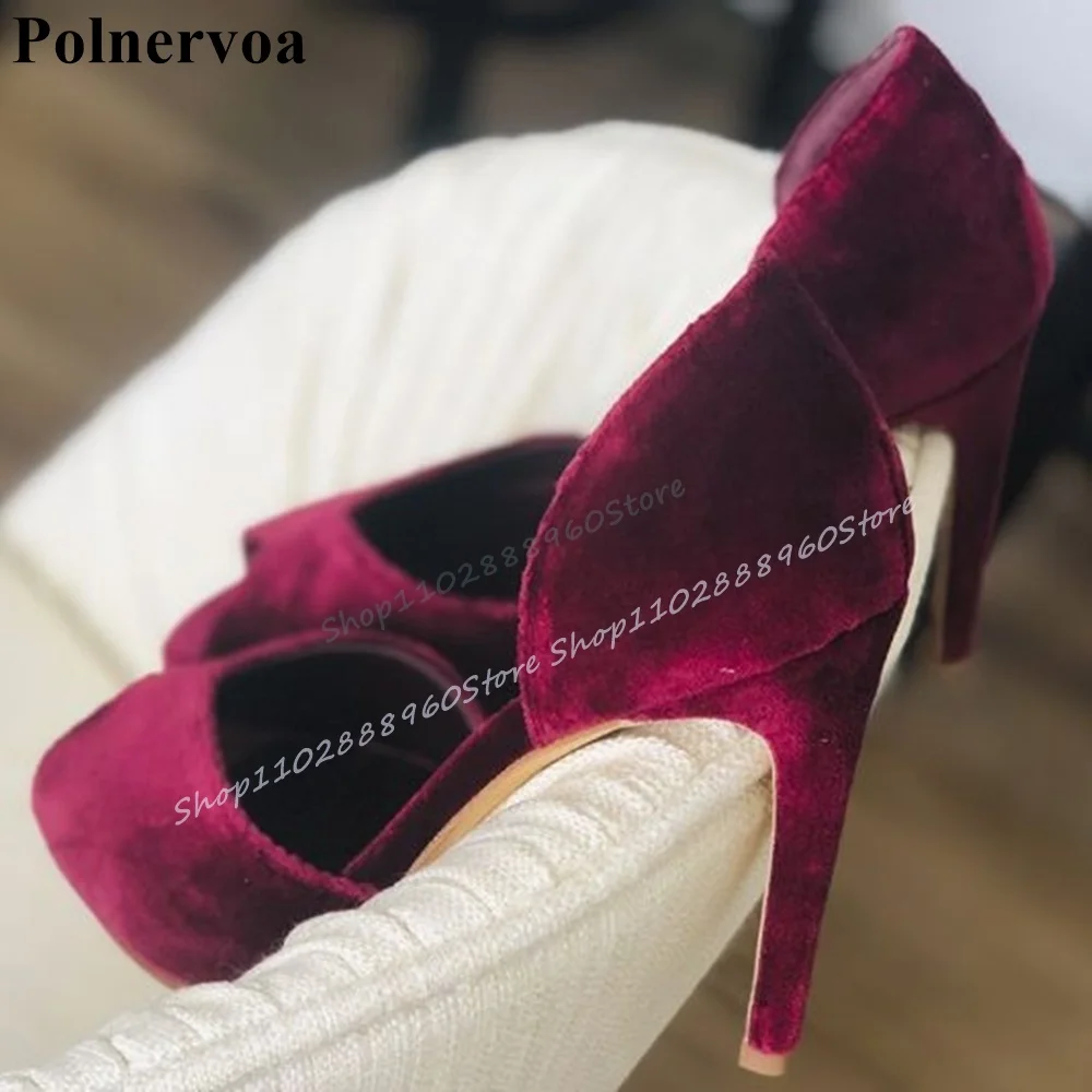Burgundy Suede Luxurious Sandals Stilettos High Heel Shallow Women Shoes Slip On Peep Toe Banquet Fashion Zapatos Para Mujere