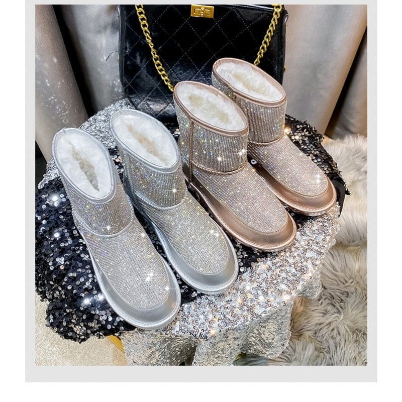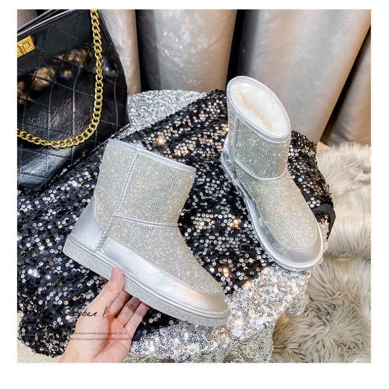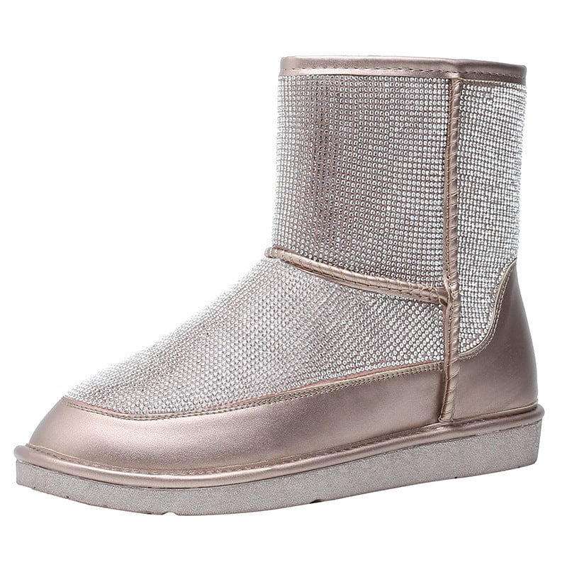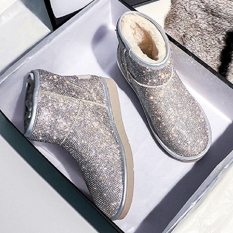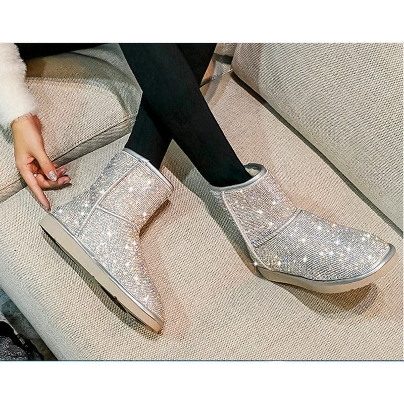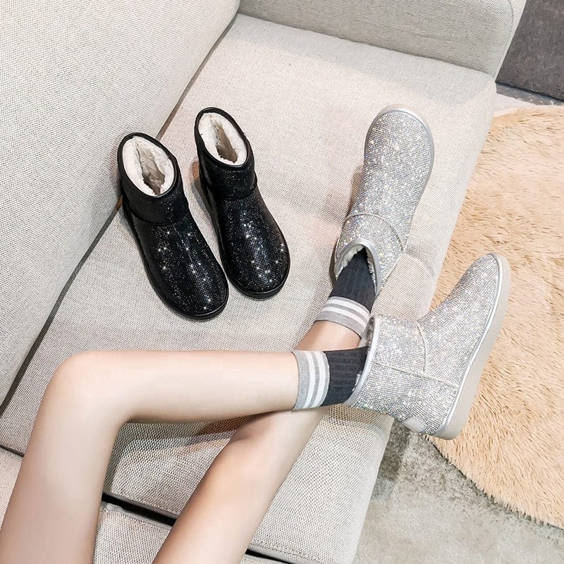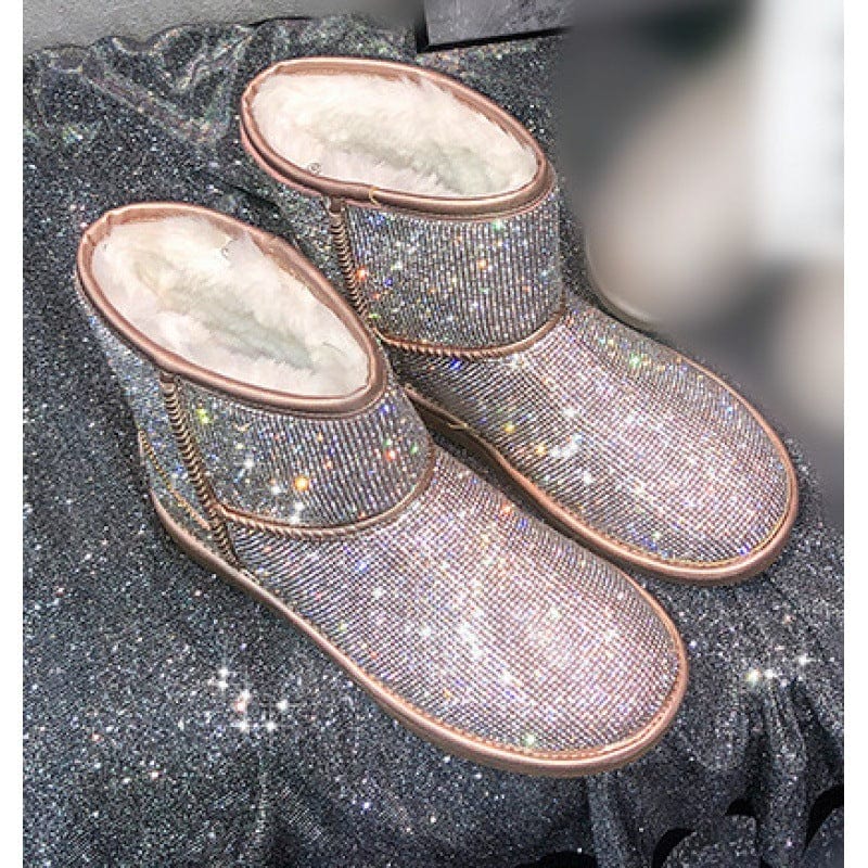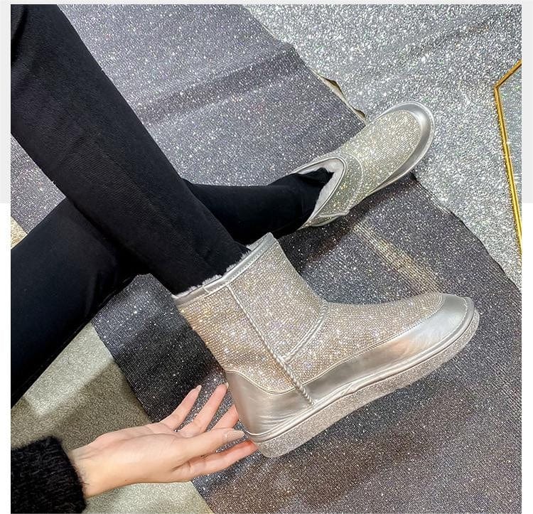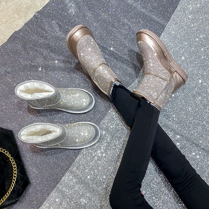 BUSY GIRL YN4386 Snow Boots Women Plush Rhinestone Winter Warm Round Toe Flat Heel Blingbling Shiny Ankle Boots for Women