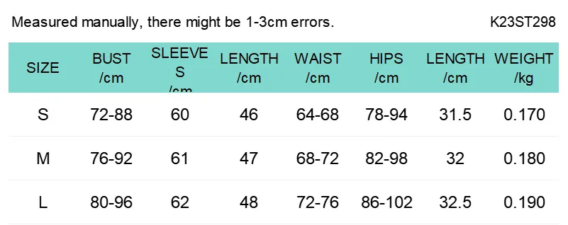 (Note:All weights and sizes are measured,SIZE ERROR up1-3CM,WEIGHT ERROR at most 10g .)