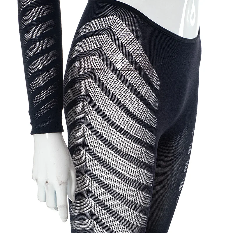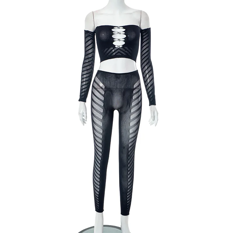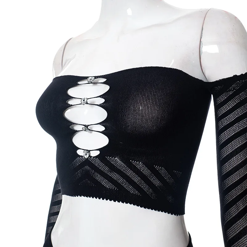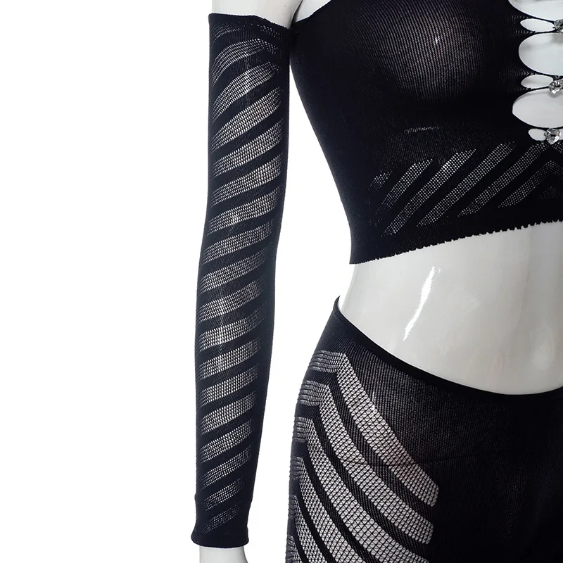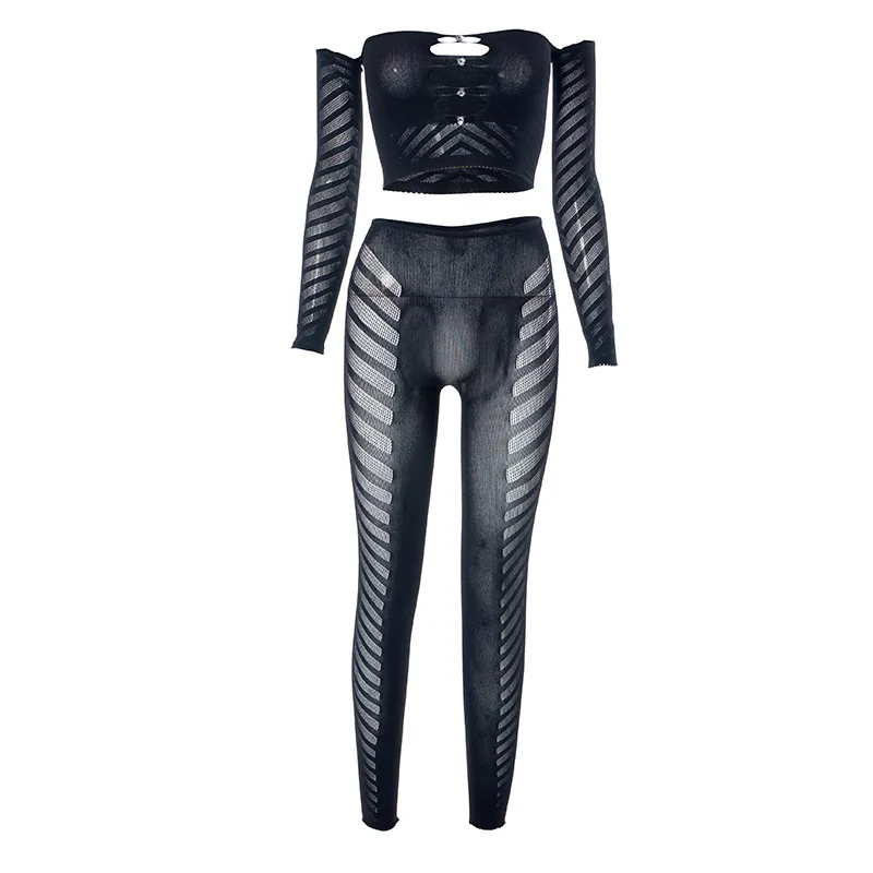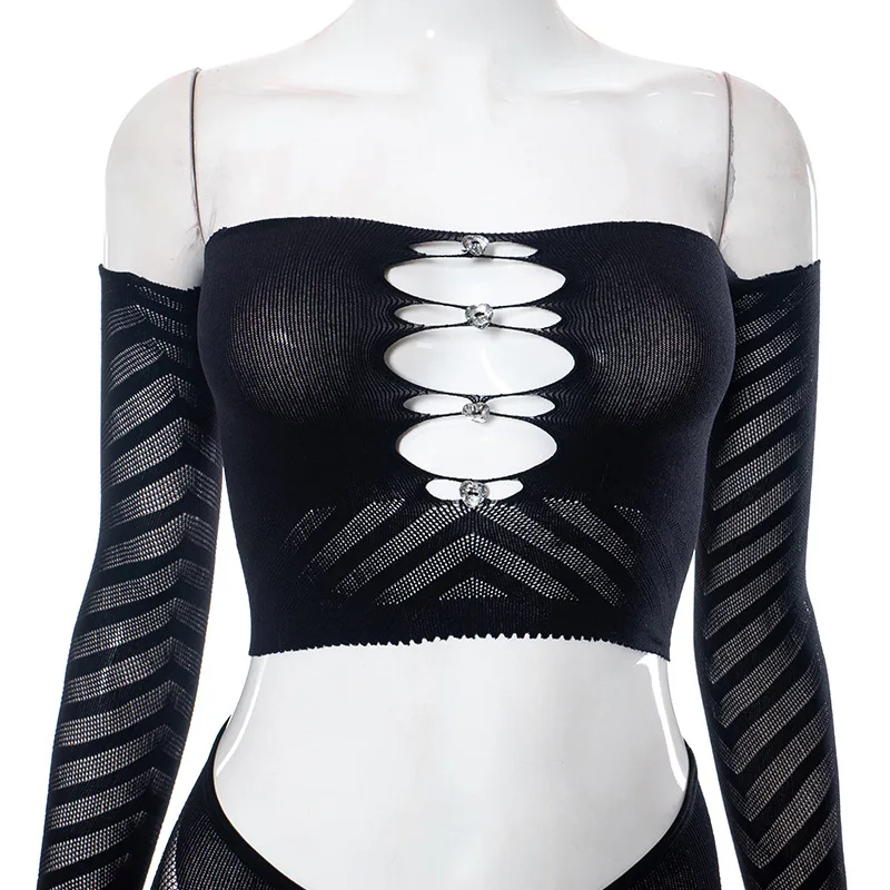 C0433 2023 Mesh Hollow out Diamond Wrapped Chest Long Sleeve Top Tight Sexy Pants Women's Two Piece Set