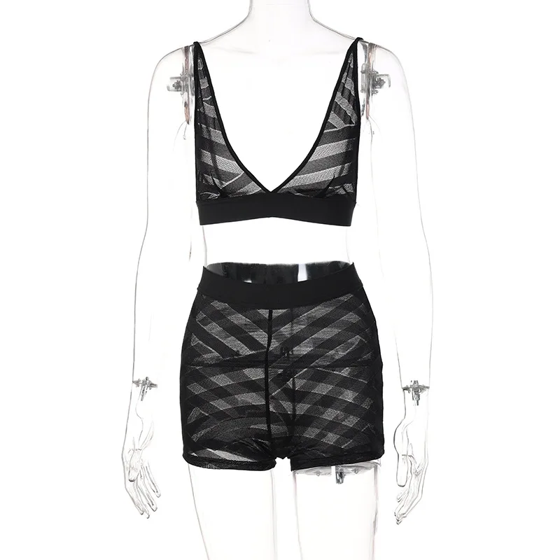 C0566 New women's sexy mesh patchwork shorts and small tank top set for women