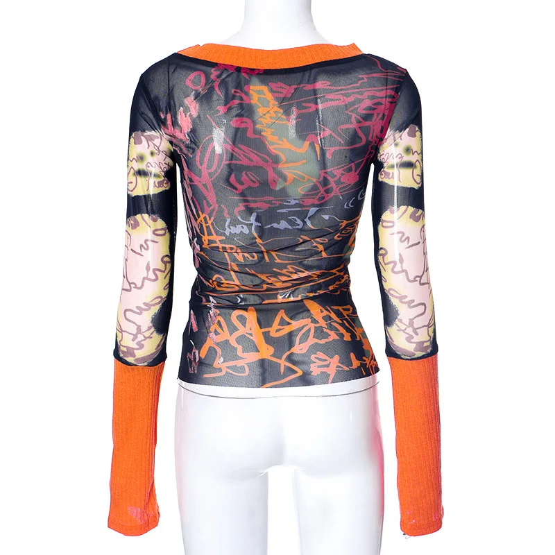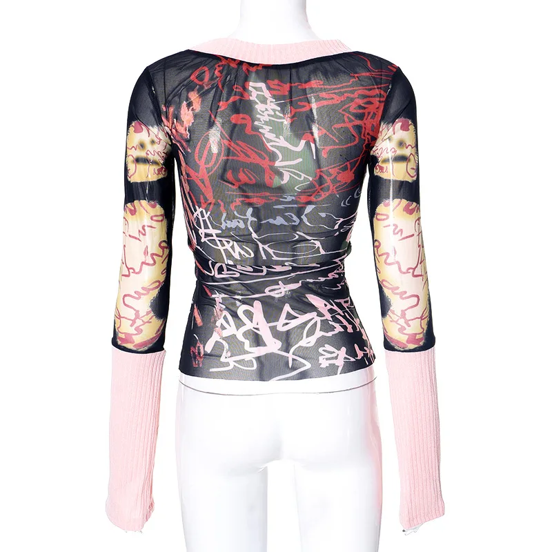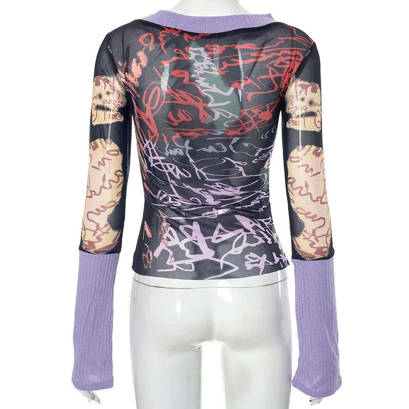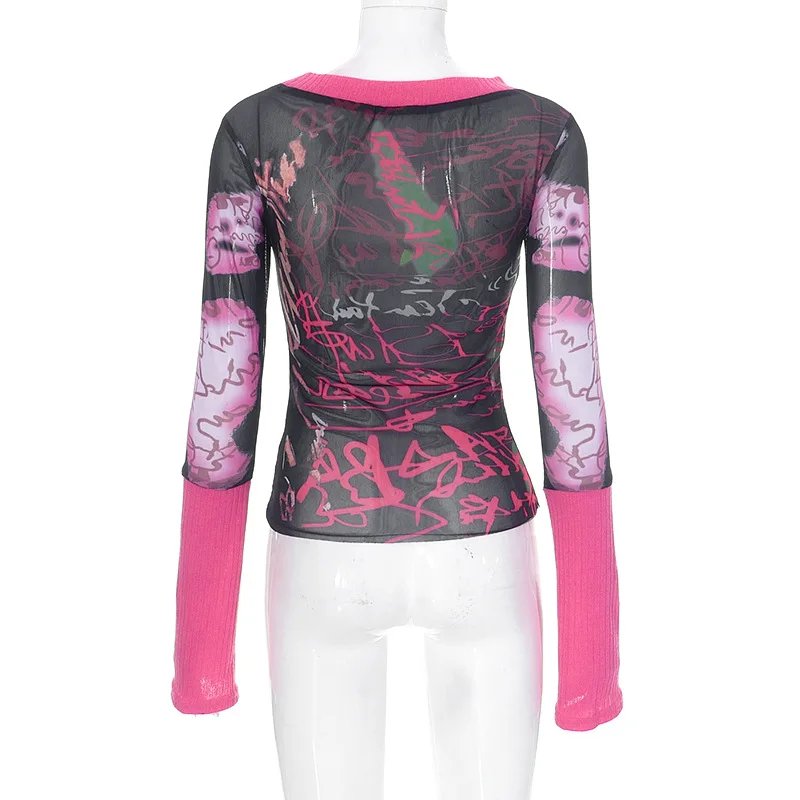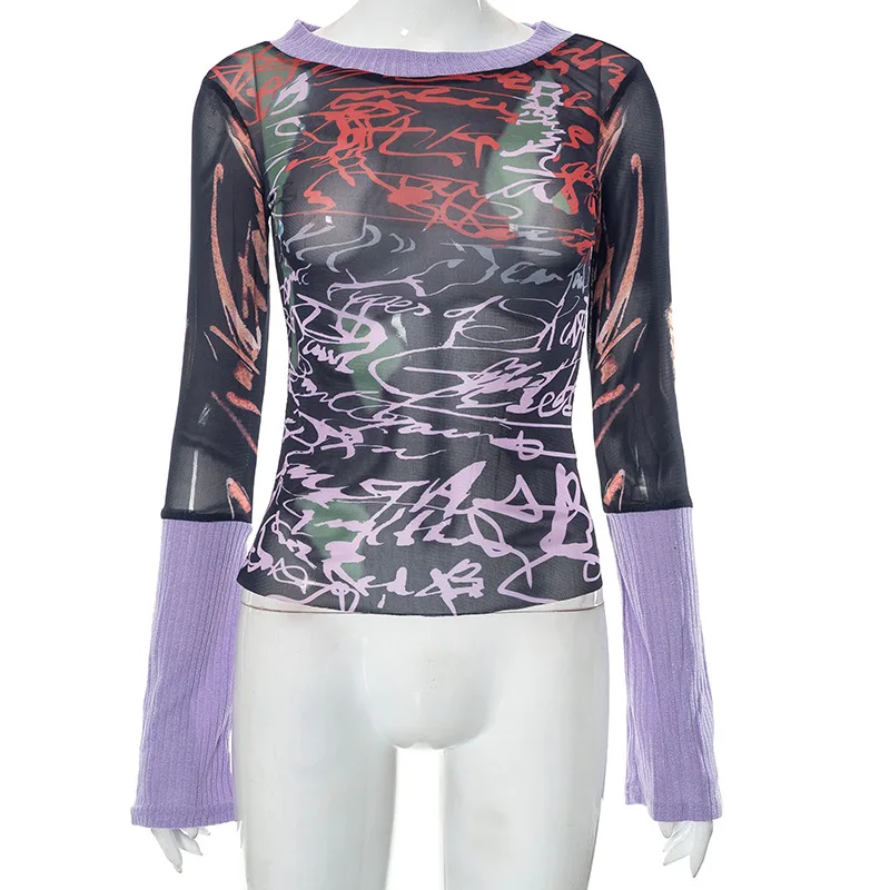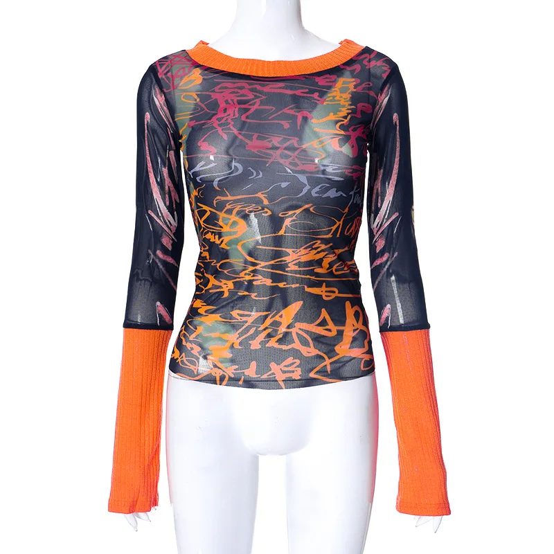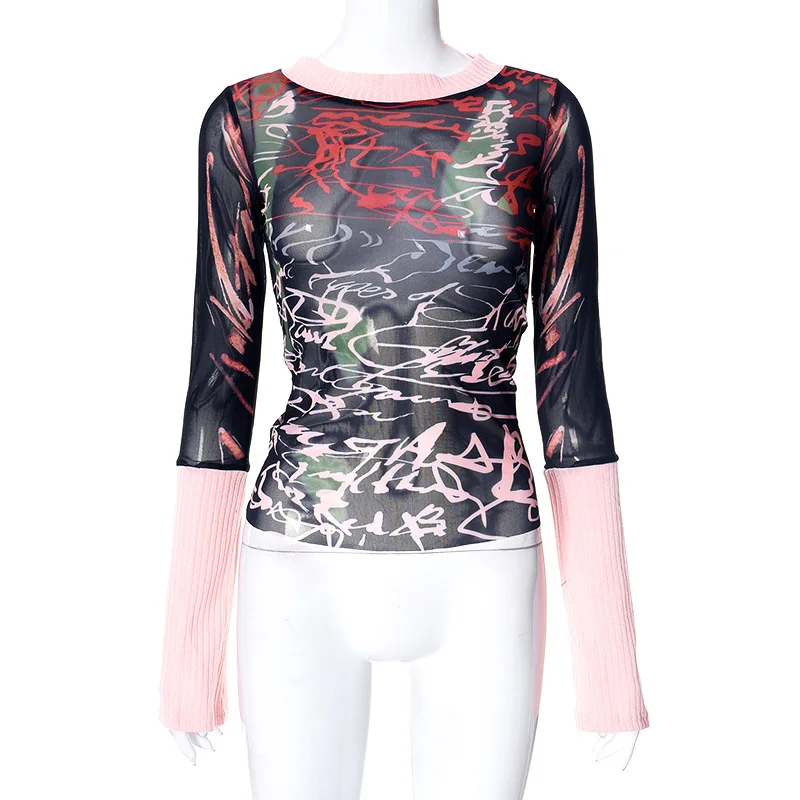 C2037 Autumn New Round Neck Pullover Long Sleeve Mesh Printing Casual Women's Knitted T-shirt