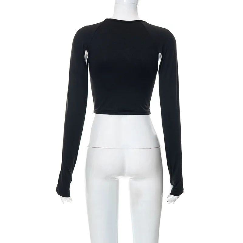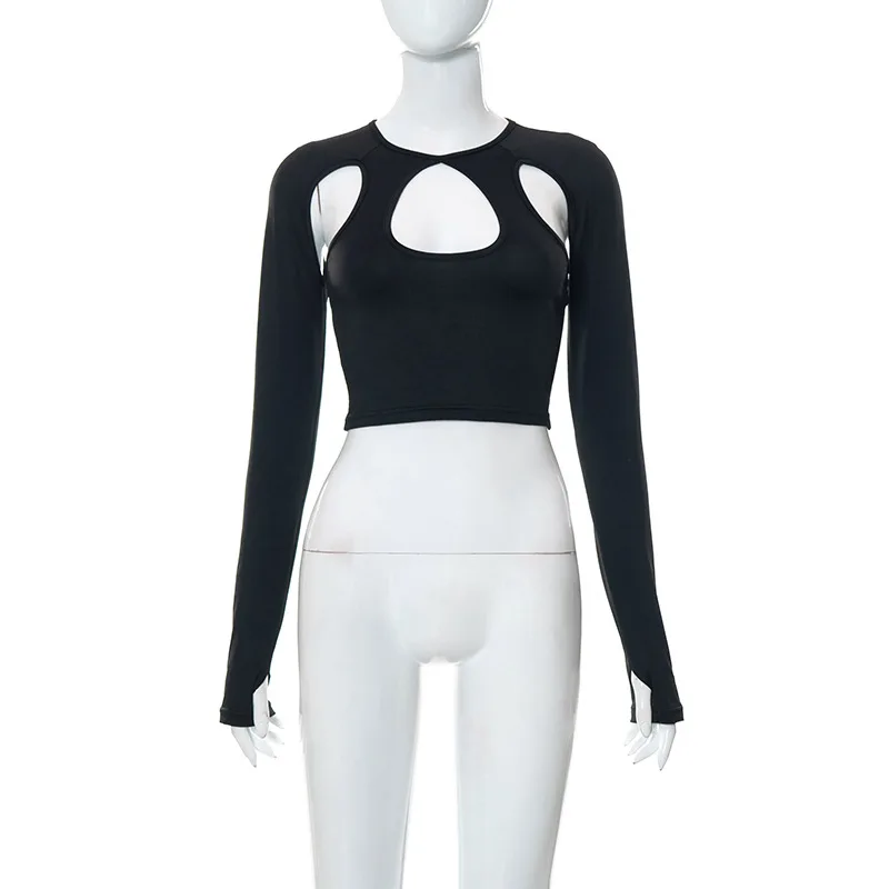 C22TP123 New Arrivals Summer New Solid Open Navel Hollow Long Sleeve Slim Top Black Fashionable Tops