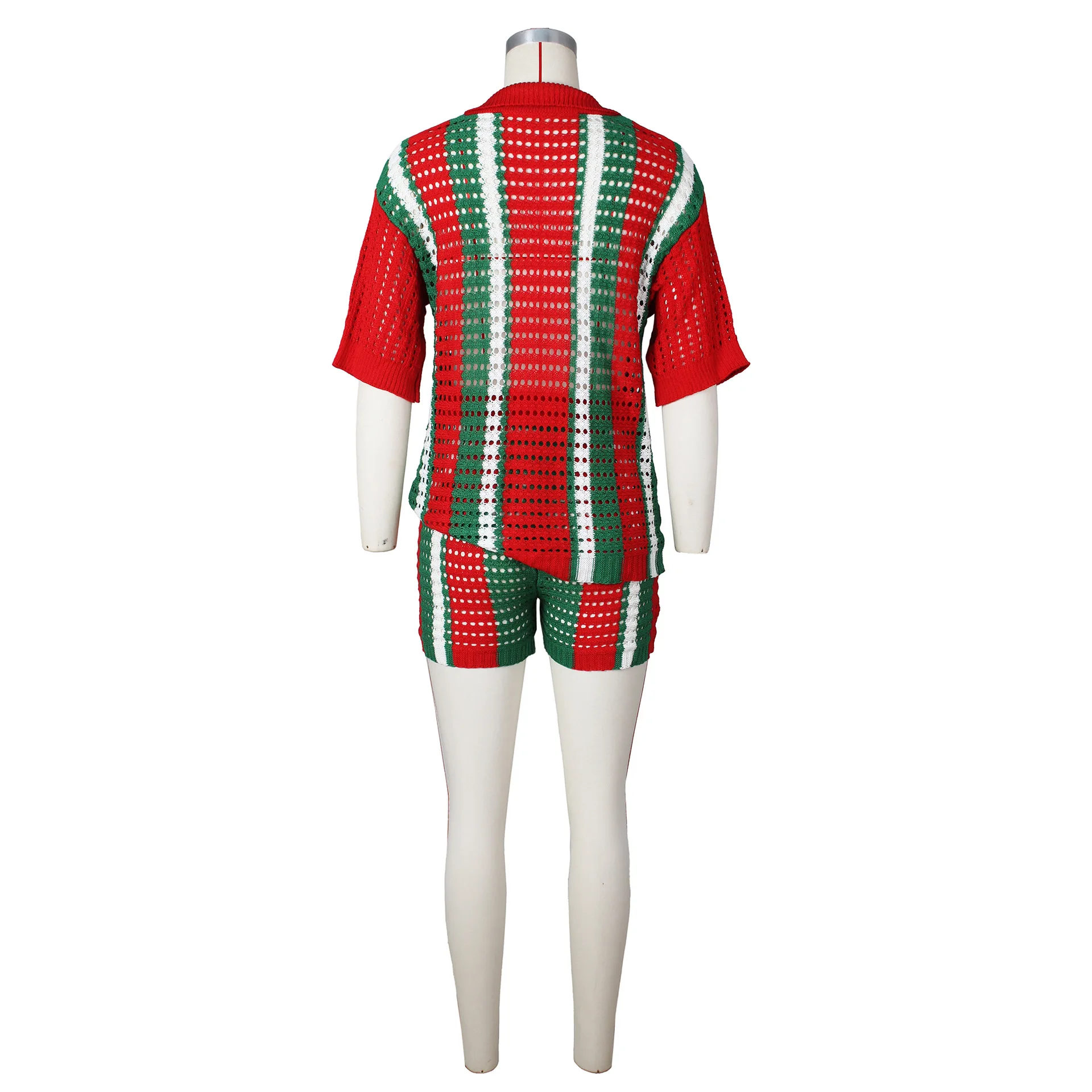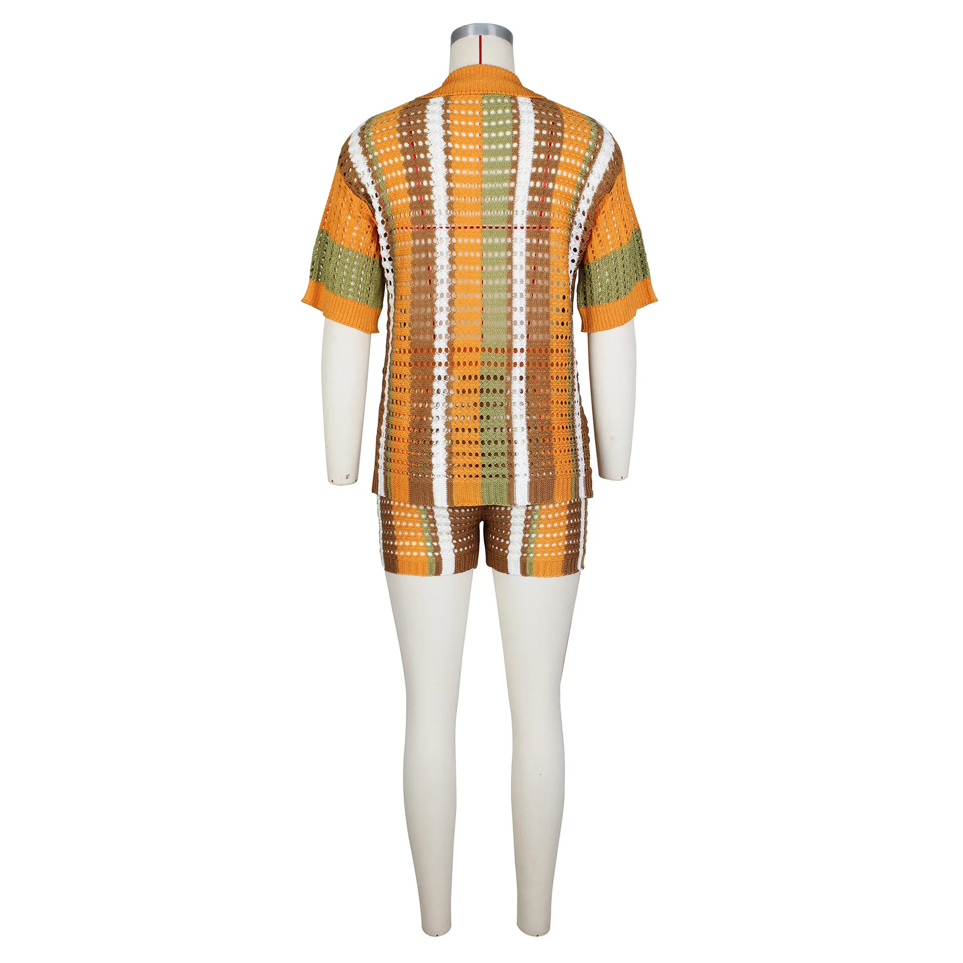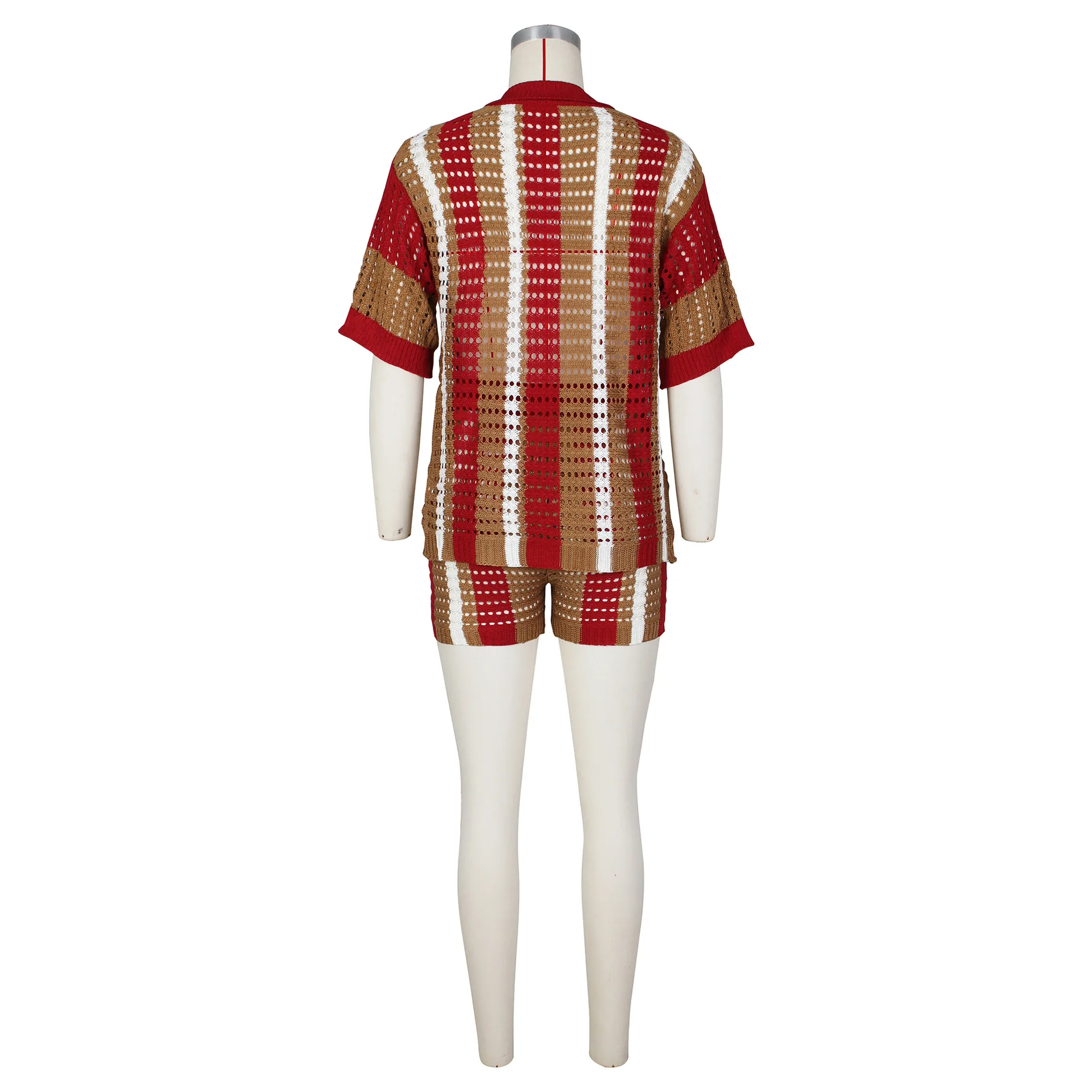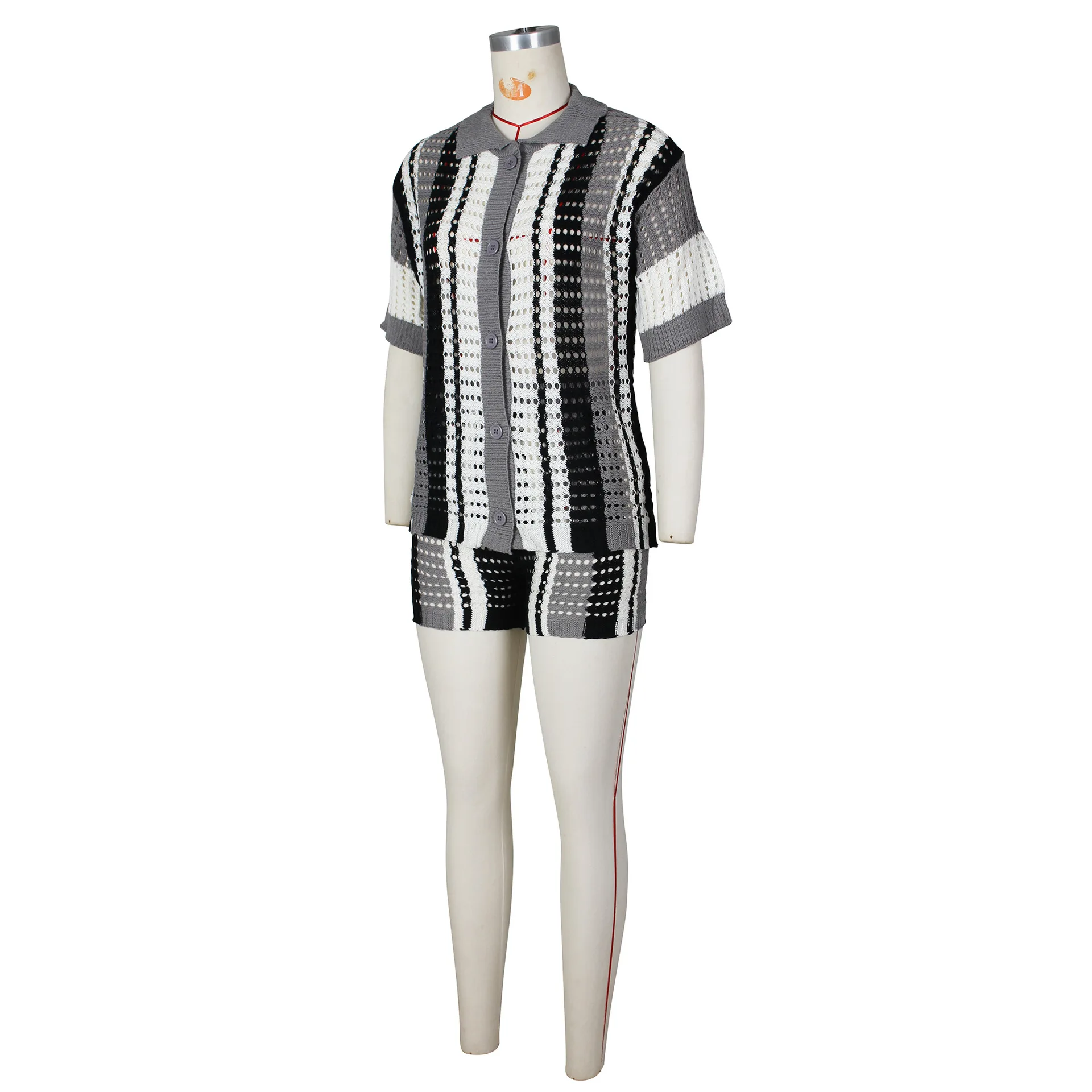 C2411 Hot selling sexy women's hollowed out striped lapel knit shorts casual set
