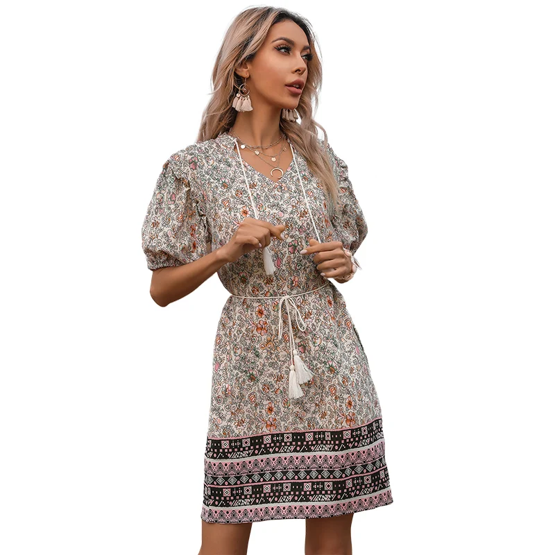 Casual Dress Print Women 3 4 Sleeve Mini Length Navy Blue Quantity Custom OEM Spandex Silhouette Anti Rayon Long Logo Style Time