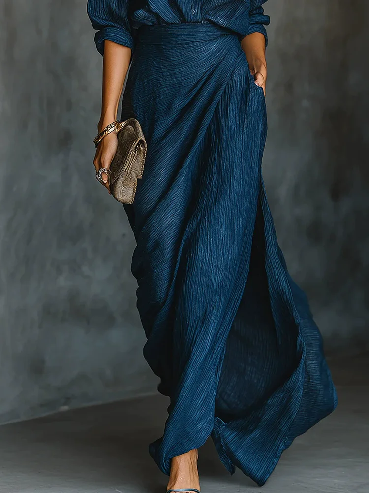 Casual Loose Buttons Shirt And Maxi Skirt 2PCS Sets Women Autumn Elegant Fashion Outfit 2025 Solid Patchwork Office Ladies Suits