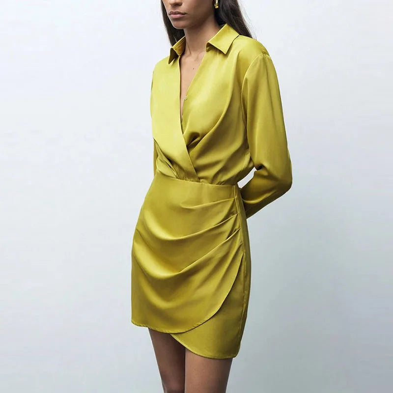 Casual Office Wrap Hip Short Dresses Autumn New Satin Solid Color A-line Dress 2025 Fashion V-neck High Waist Pleated Mini Dress