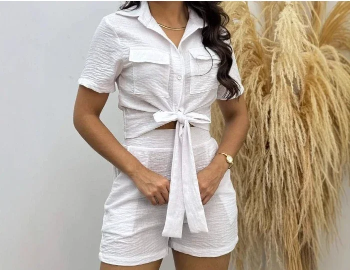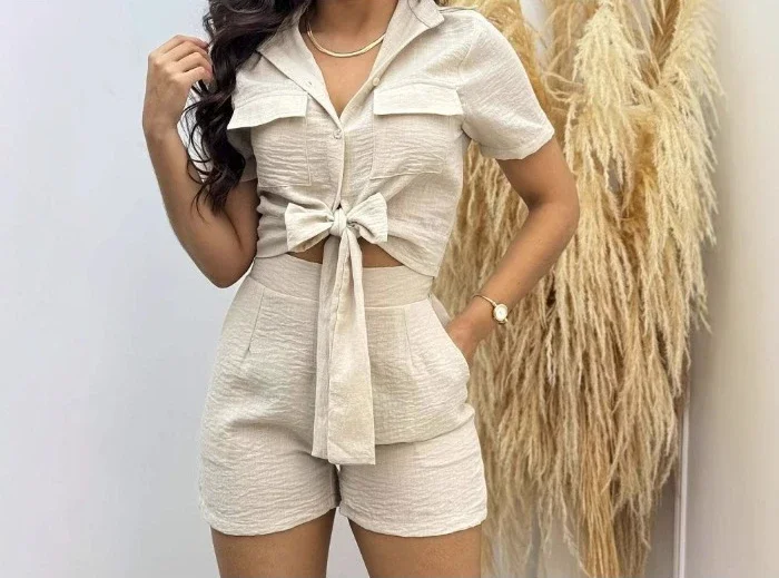 Casual Shorts 2 Piece Sets Woman Fashion Short Sleeved Lace Up Shirt and Half Pants Suit Streetwear 2025 New Spring and Summer