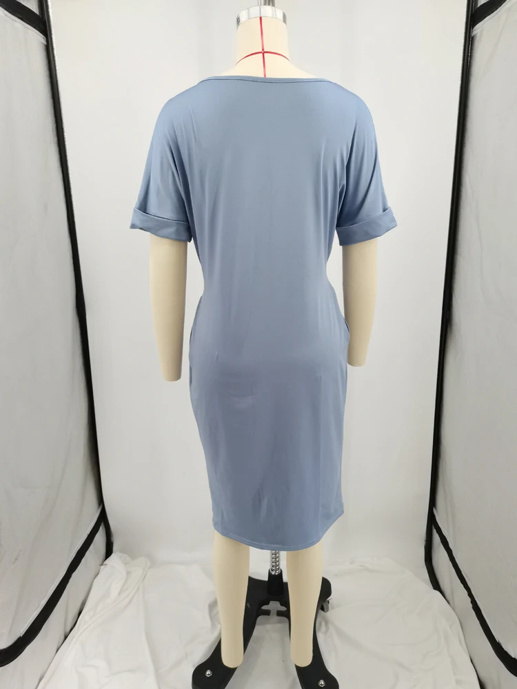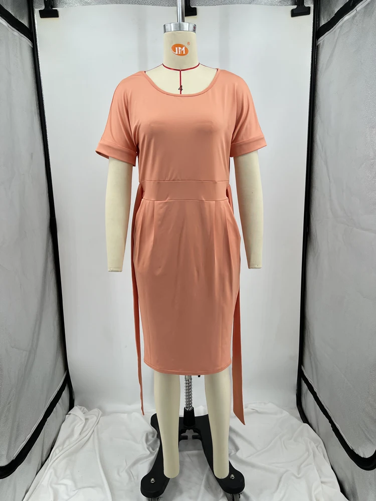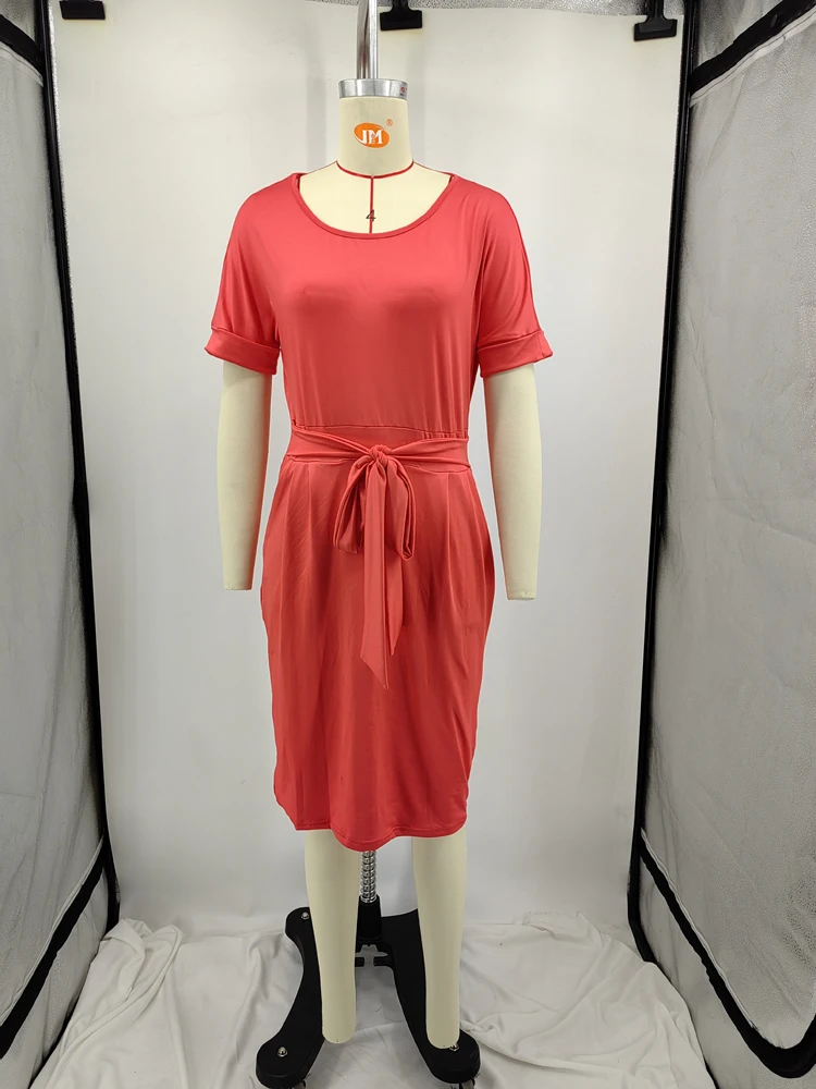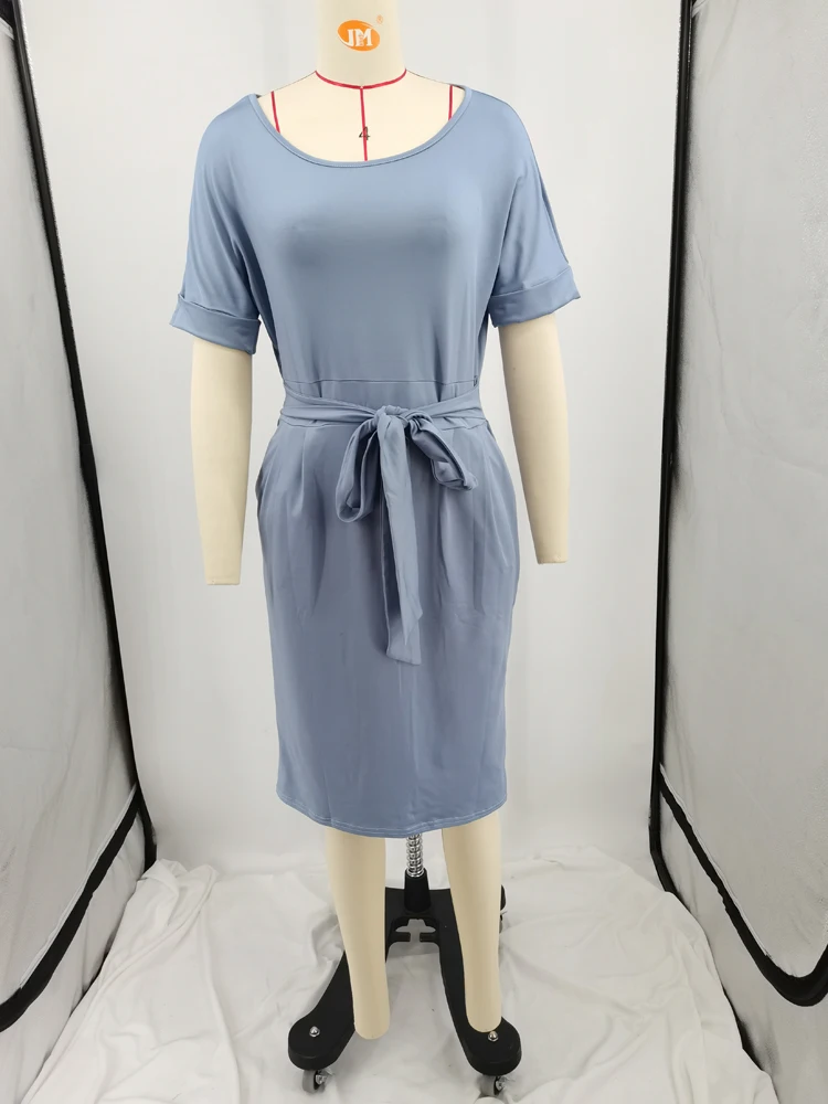 Casual Summer Dresses for Women Fashion Wholesale Quality Dresses Short Sleeve Lace-up Solid Color Bodycon Dress with Pockets