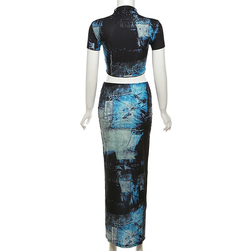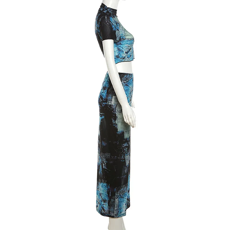 Casual Summer Patchwork Short Sleeve Crop Top Long Skirt Color Printed Block 2 Piece Set Outfits Women Two Piece Skirt Set