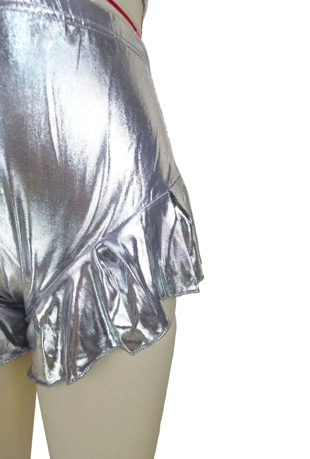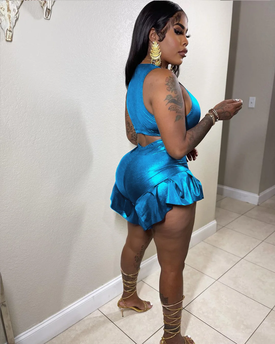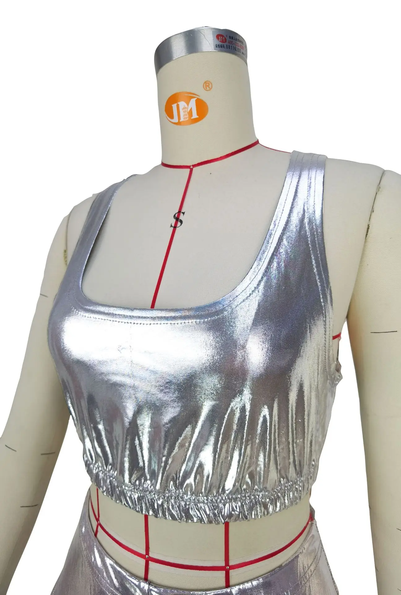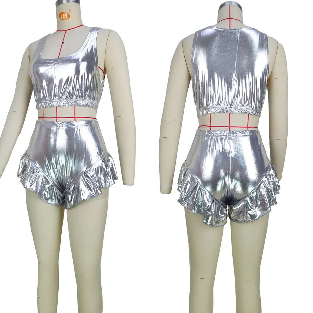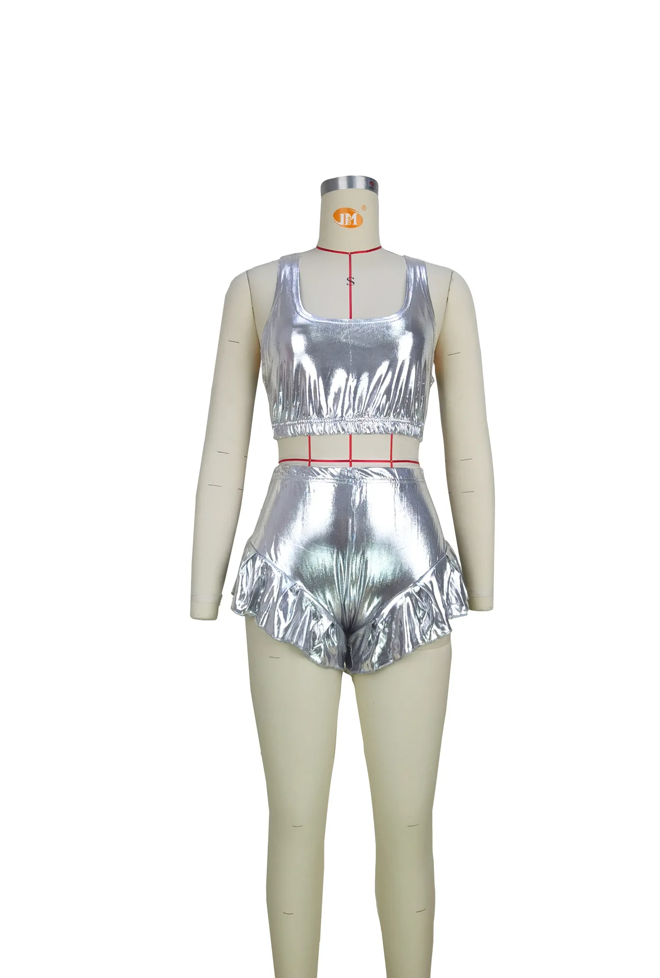 casual Trendy Metallic Pleated Hem two piece crop top cargo short sets for women 2023