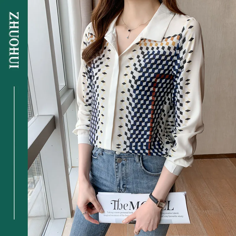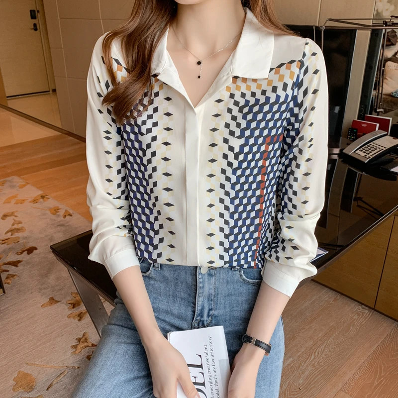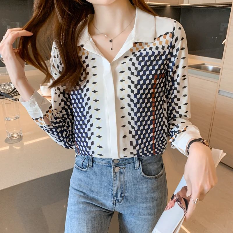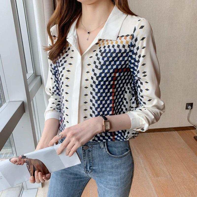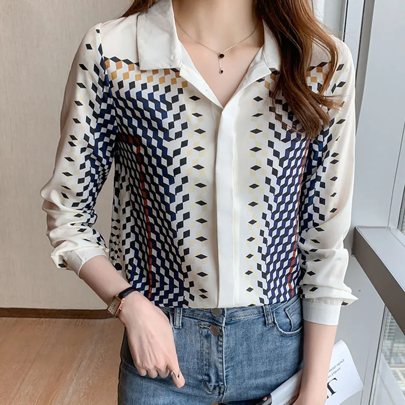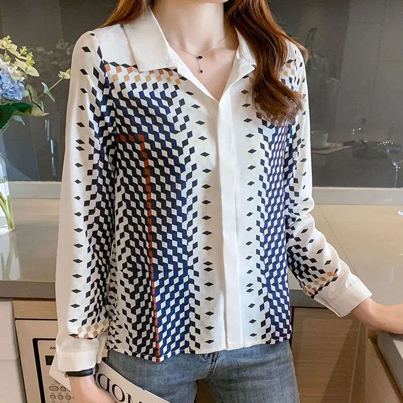 Casual Turn Down Collar Long Sleeve Slim Print Blouse Tops Women Slim Basics Shirts Ladies Clothes