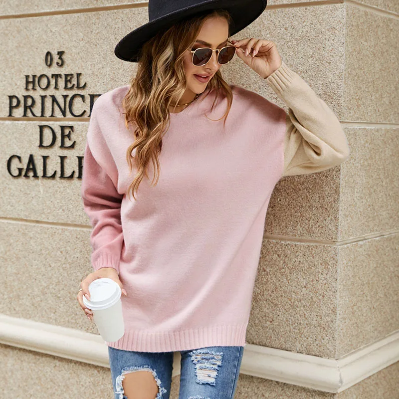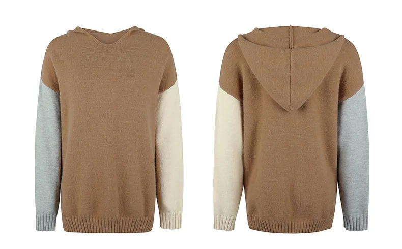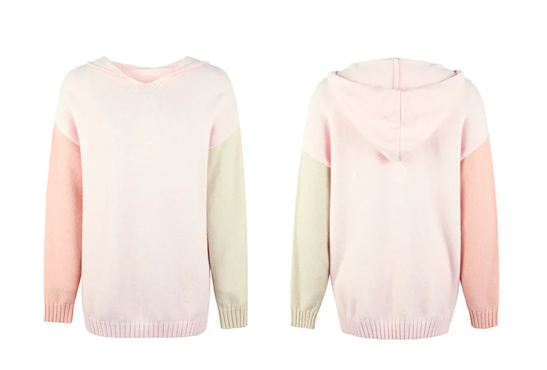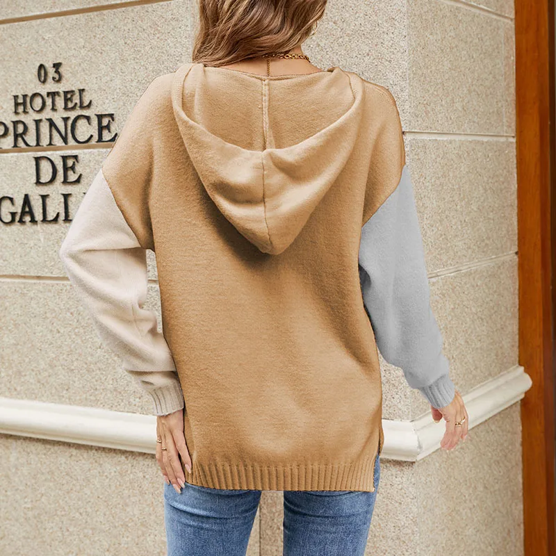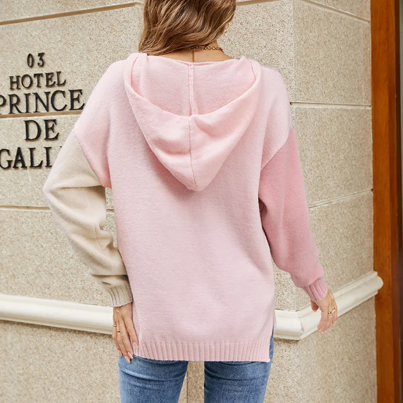 Chic Contrast Color Drop Shoulder-Sleeve Patchwork Pullover Sweater Hoodies Women Casual Knit Jumper Ladies
