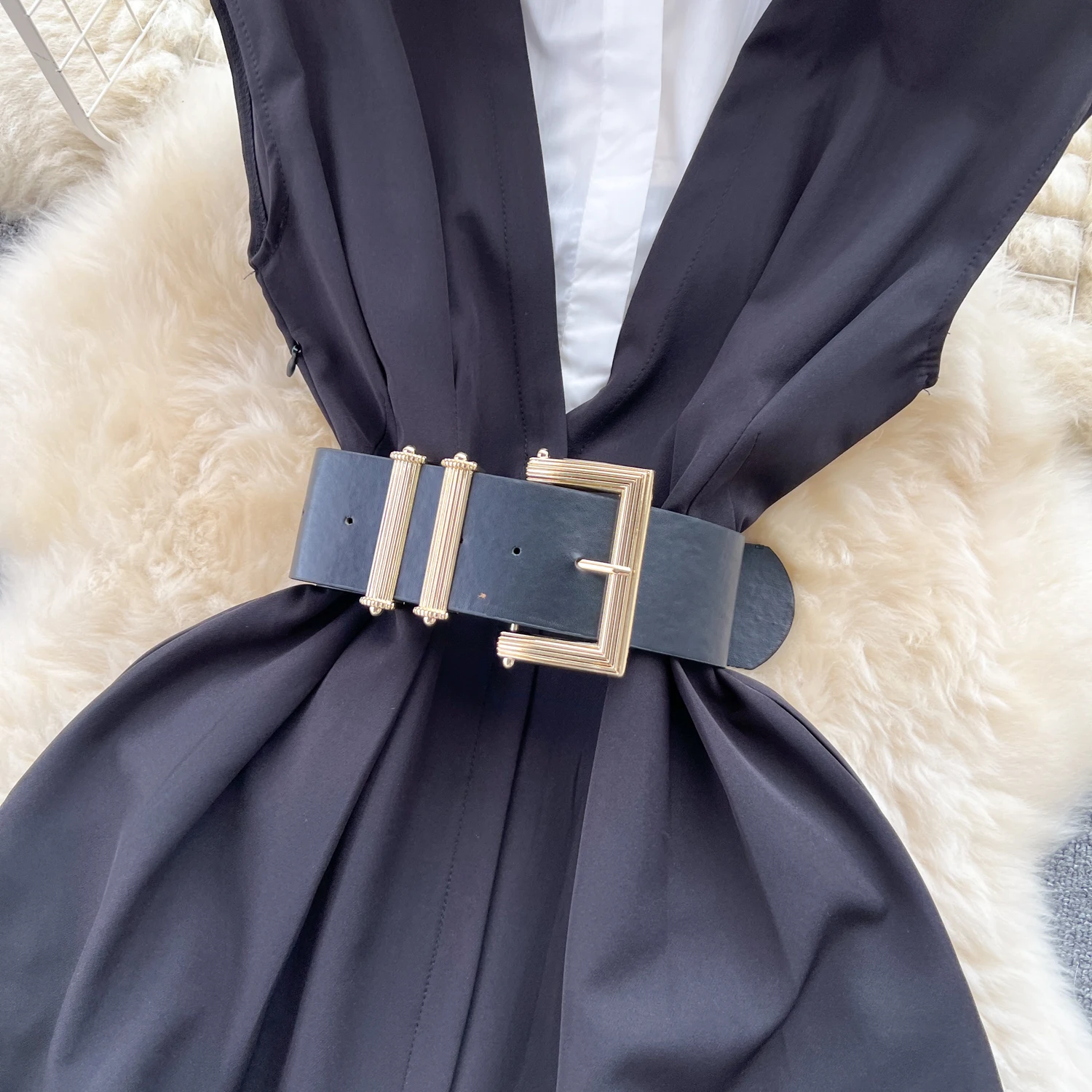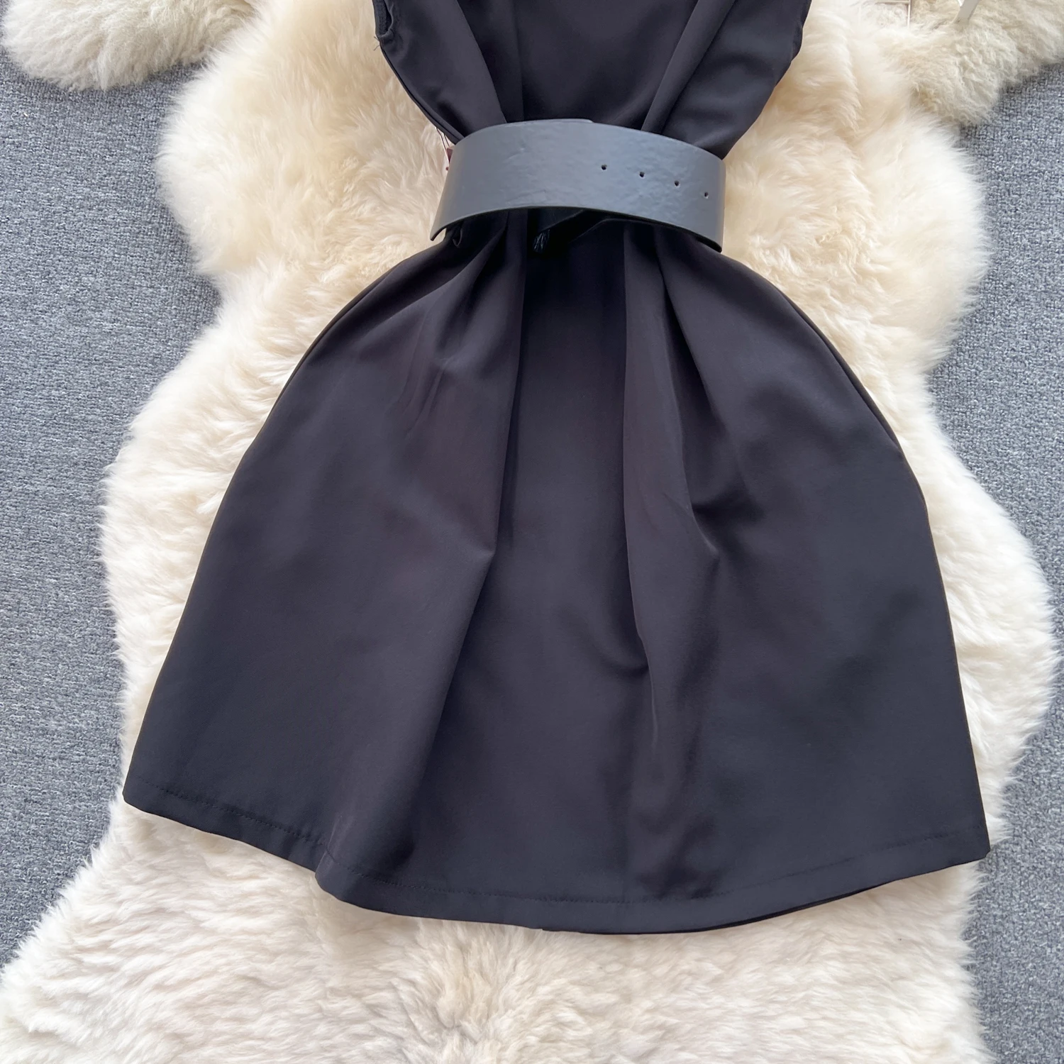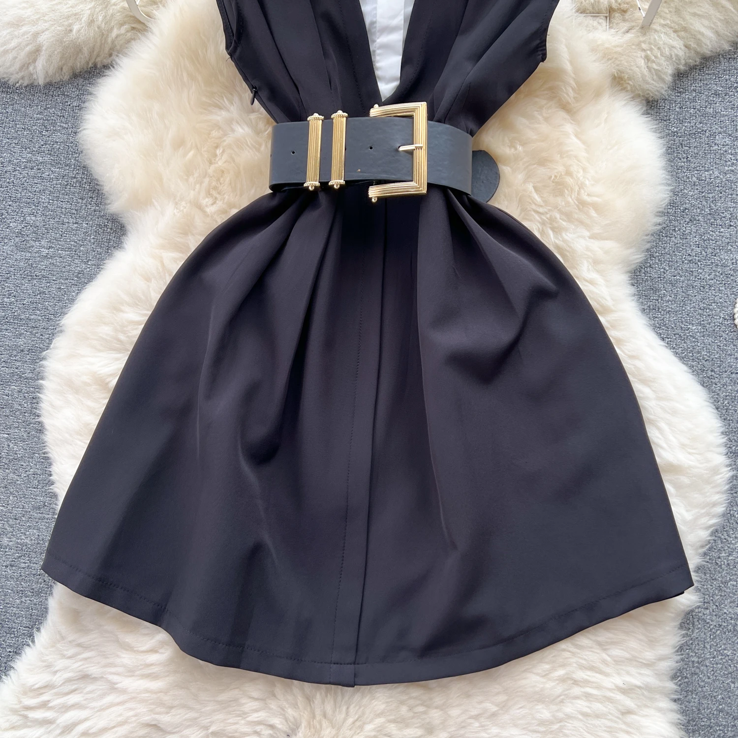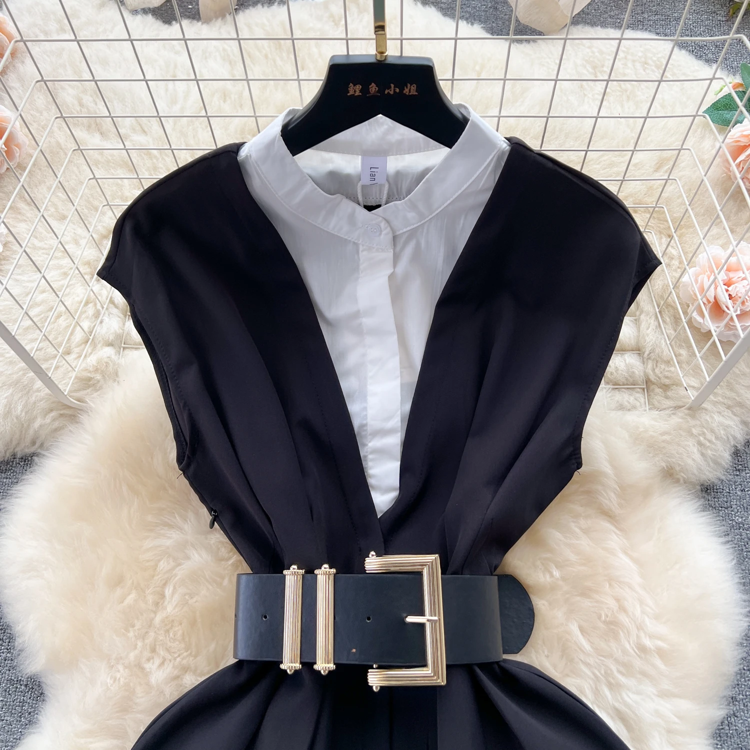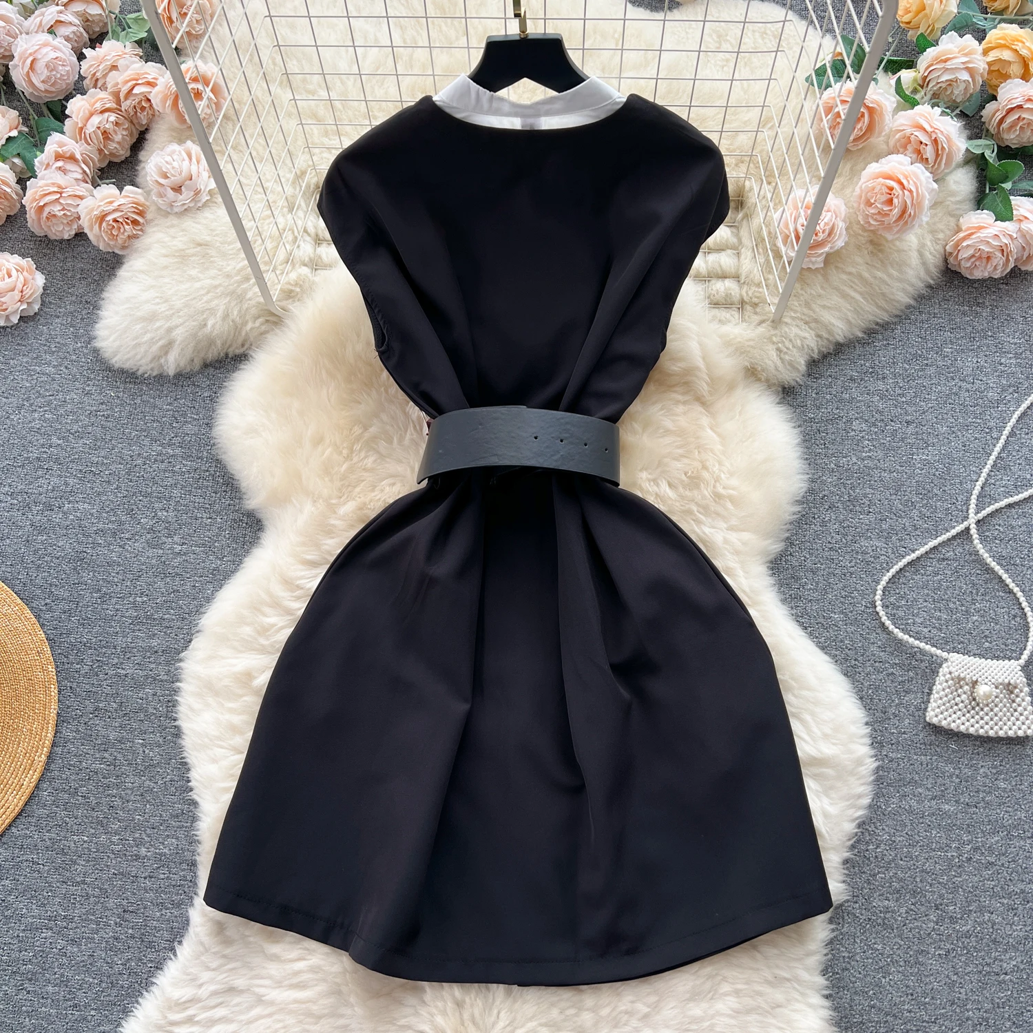 Chic Fashion Mature Style Retro Round Neck Splice Fake Two Piece Sleeveless Dress Women's Waist Slim Short Skirt