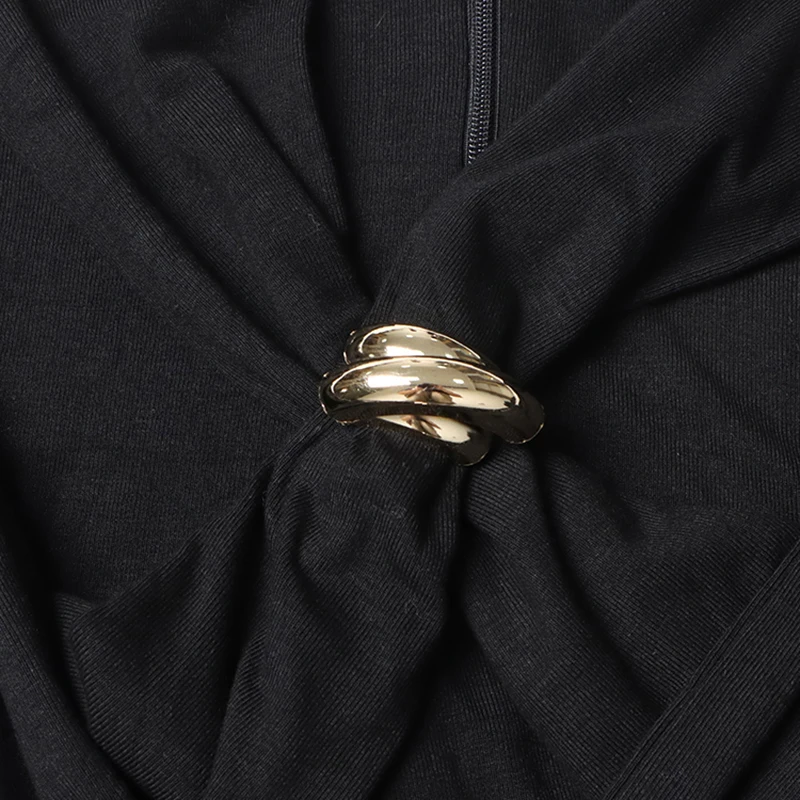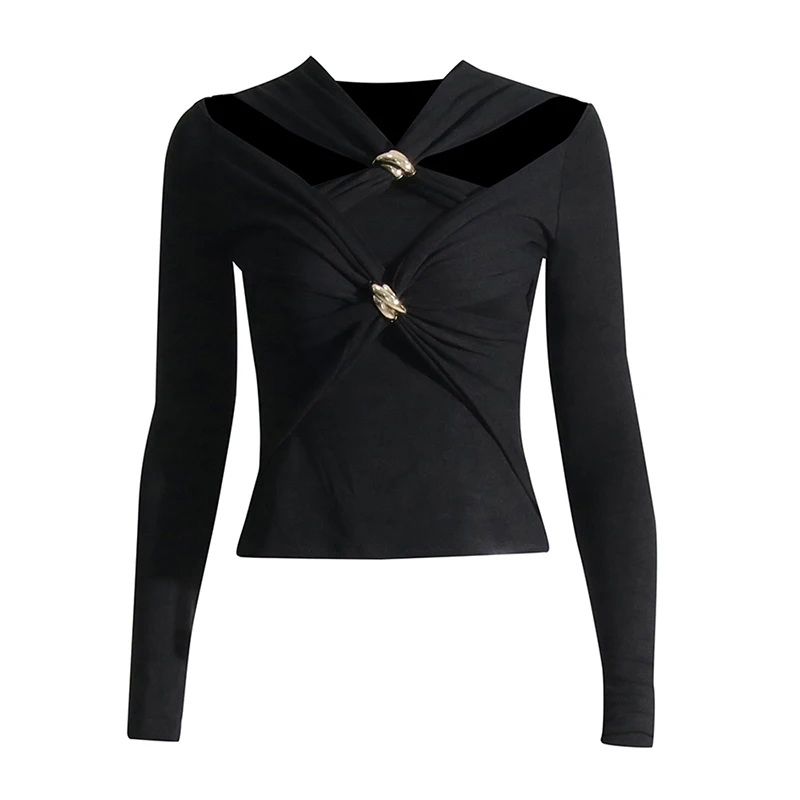 CHICEVER Casual Patchwork Metal Buckle Crisscross Cotton Long Sleeve T Shirt For Women