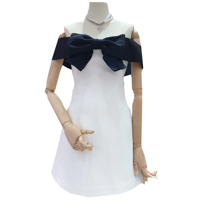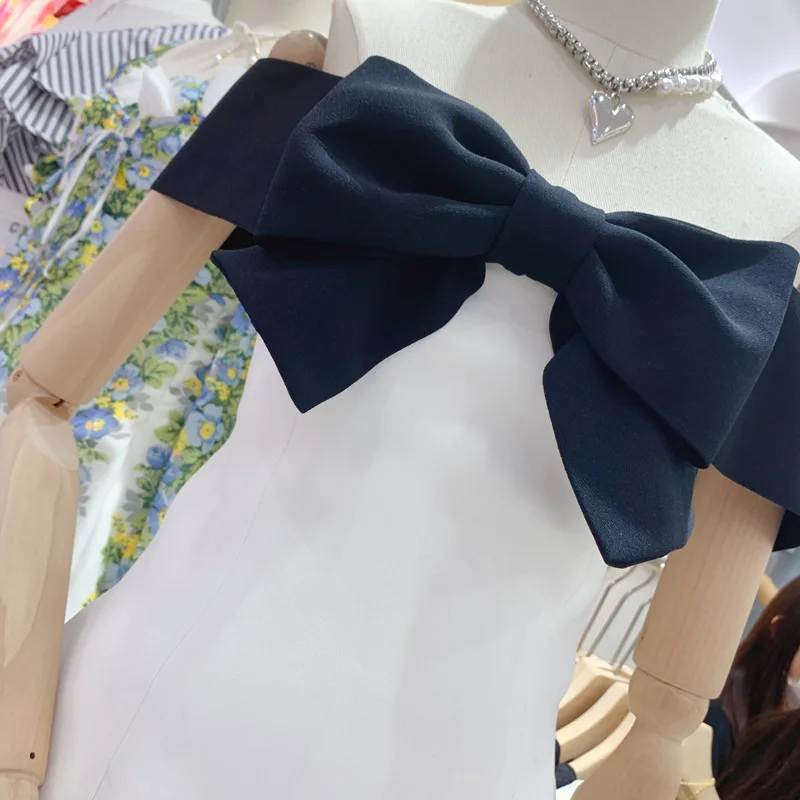CHICEVER Elegant Dresses Hit Color Patchwork Bow Slash Neck High Waist Slim Lady Dress For Women