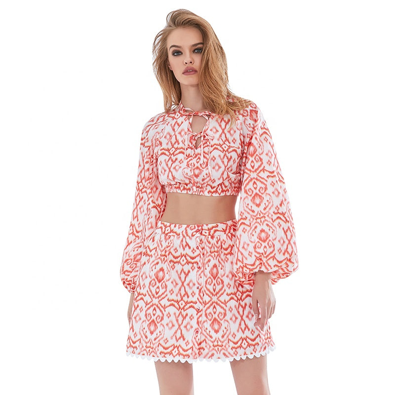 CHICEVER Print V Neck Lace Up Bowknot Lantern Sleeve Tops High Waist Skirt Plus Size Set Female