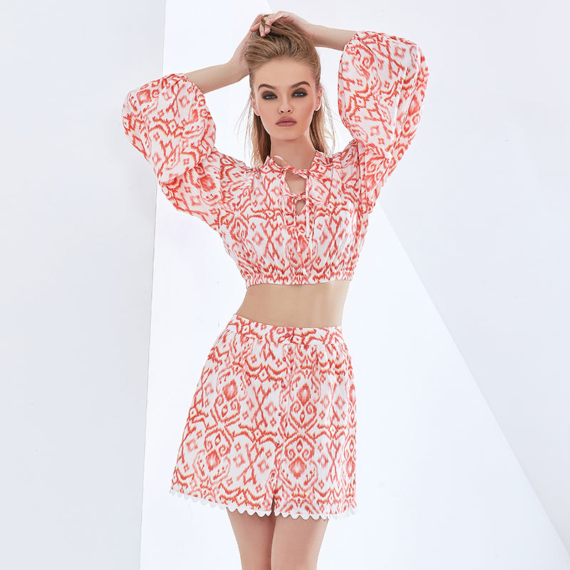 CHICEVER Print V Neck Lace Up Bowknot Lantern Sleeve Tops High Waist Skirt Plus Size Set FemaleTop
