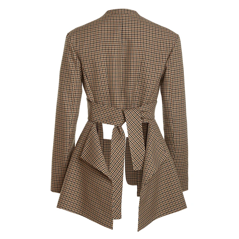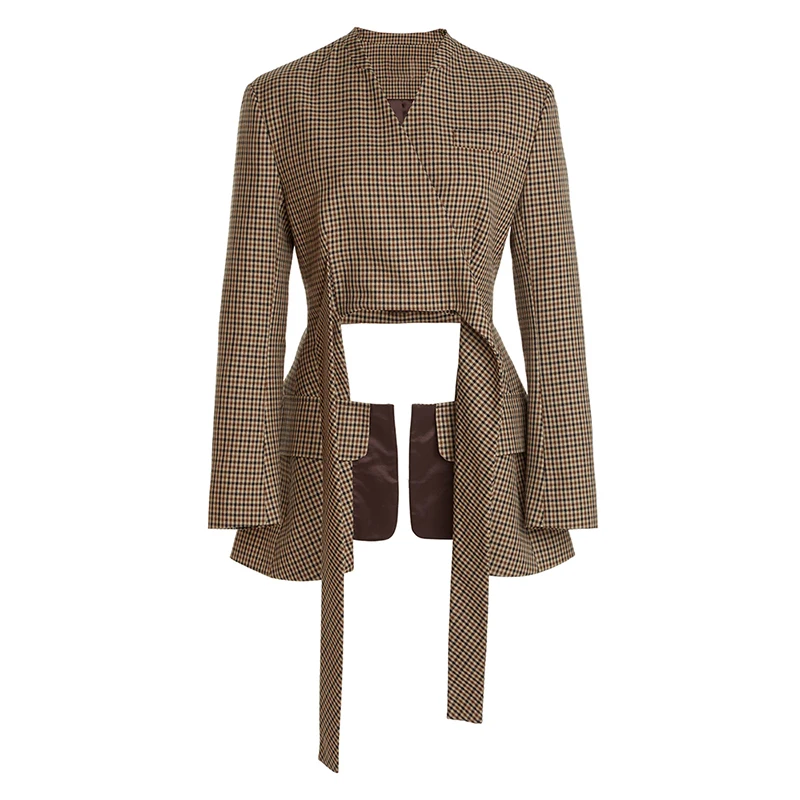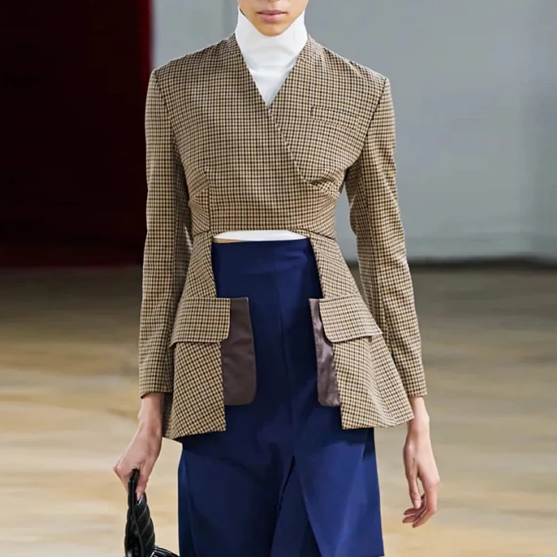 CHICEVER Winter V Neck Long Sleeve Colorblock Plaid Irregular Hem Jackets For Women 2023